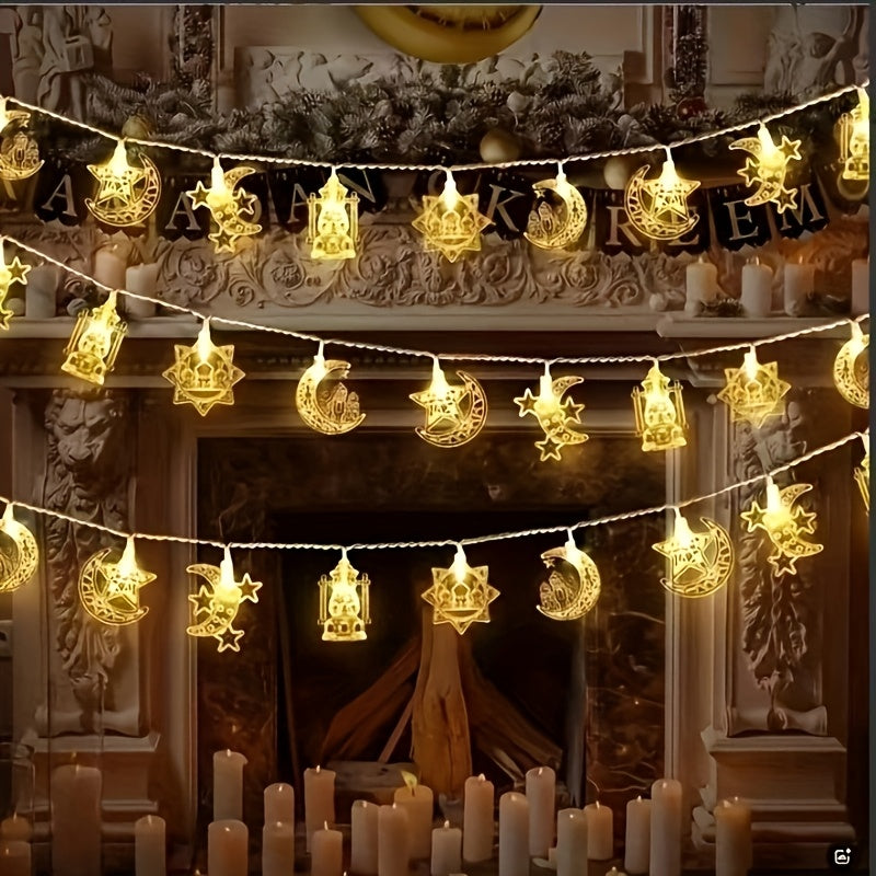 سلسلة إضاءة LED على شكل قلعة ونجمة وقلعة رمضانية، طولها 59 بوصة/10 مصابيح LED، تُستخدم كثريات جدارية داخلية في المنازل، في فصلي الربيع والصيف، وفي المهرجانات والمناسبات؛ مثالية لتزيين الأجواء الإسلامية.