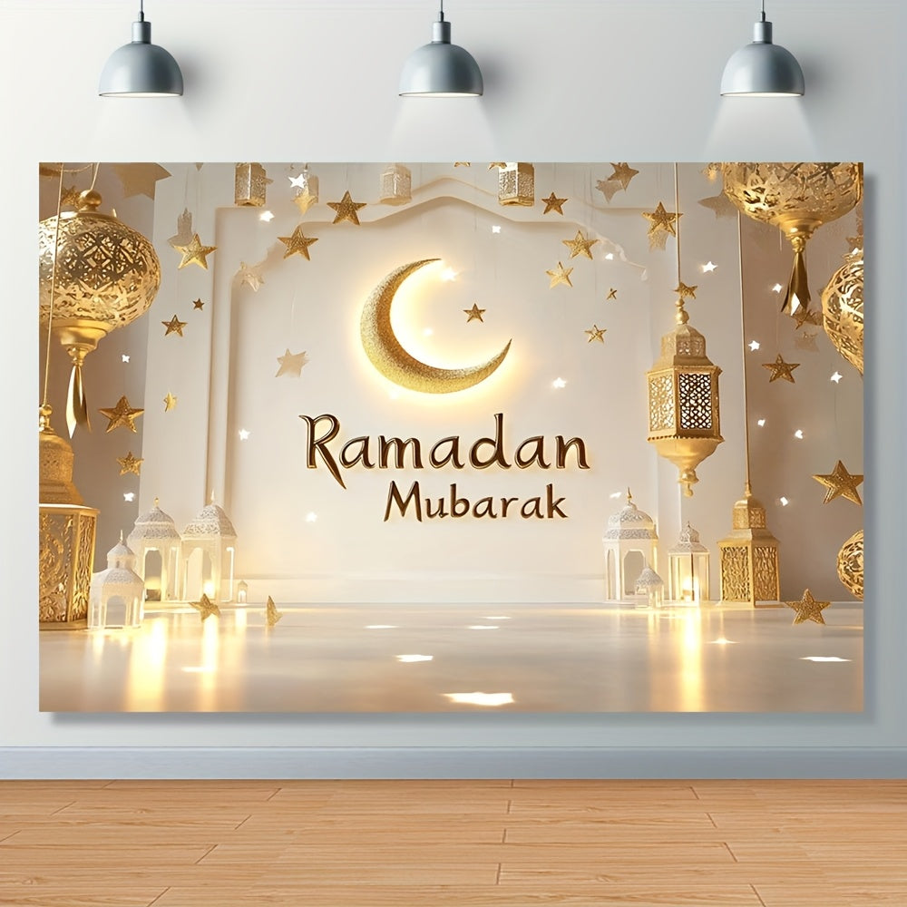 خلفية رمضان مبارك من البوليستر - طباعة مسطحة ثنائية الأبعاد مع فوانيس ذهبية وهلال ونجوم، سهلة التعليق، لا تحتاج إلى كهرباء، مثالية لحفلات الزفاف وأعياد الميلاد وحفلات التخرج وتزيين المنازل والحفلات، ديكور إسلامي