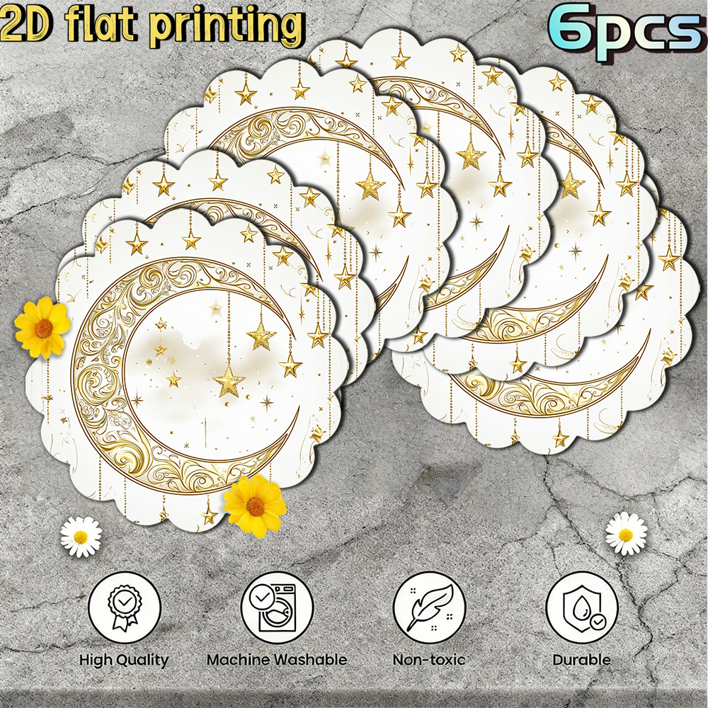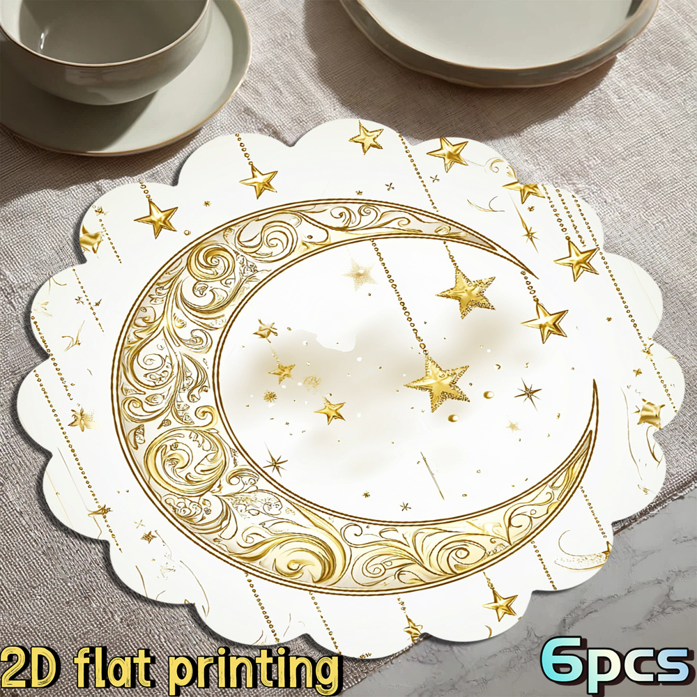 6pcs 2D Flat Printing Ramadan Golden Crescent Star Decorative Pattern Placemats, for Ramadan Gatherings, Festival Tables, Creating Warm Gorgeous Ramadan Atmosphere, Fitting Festive Meal and Table Decor, Suiting Holiday Dining