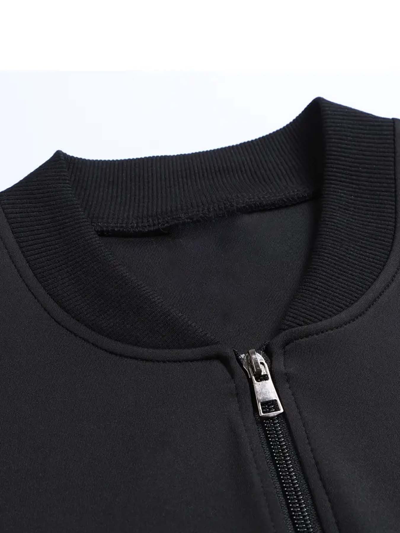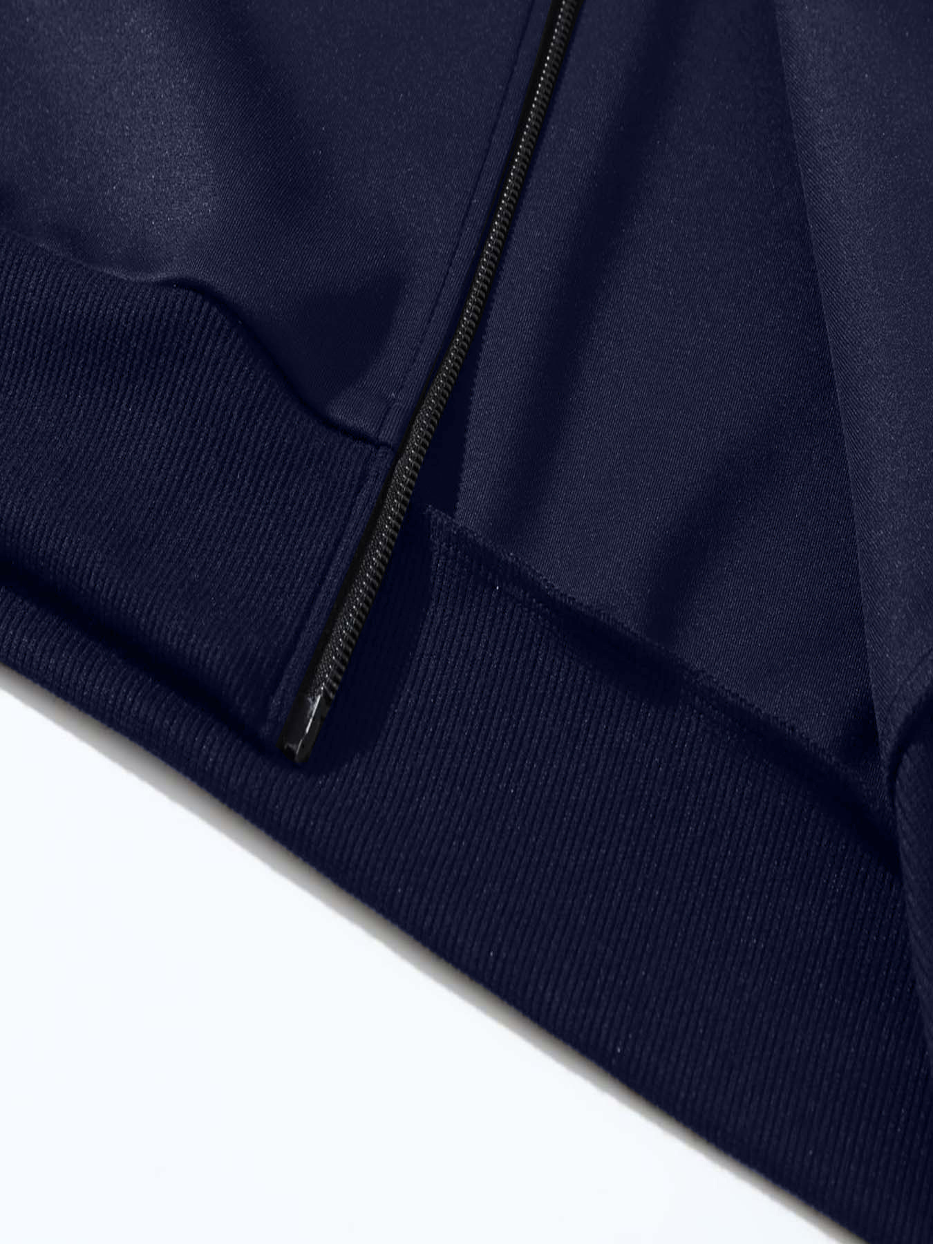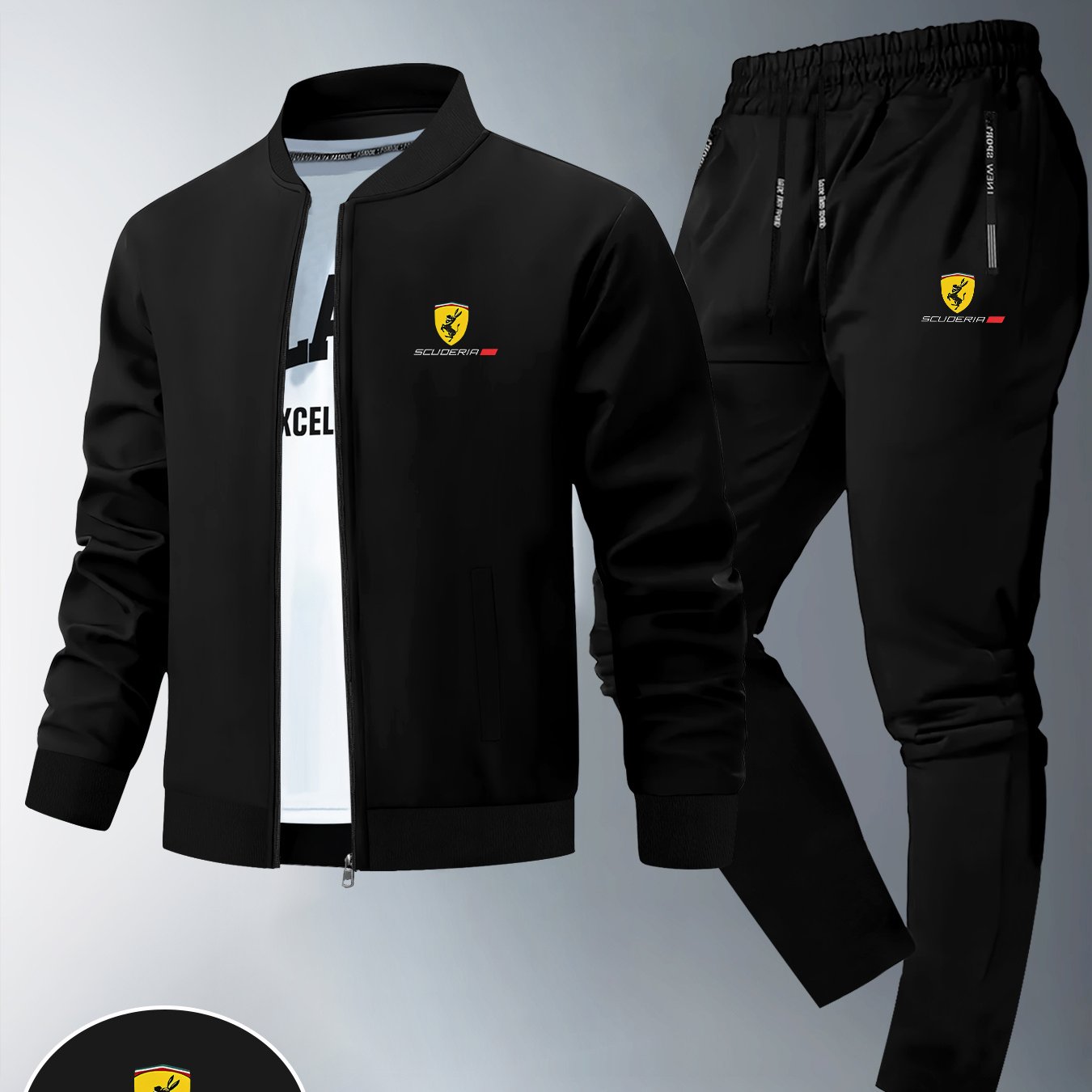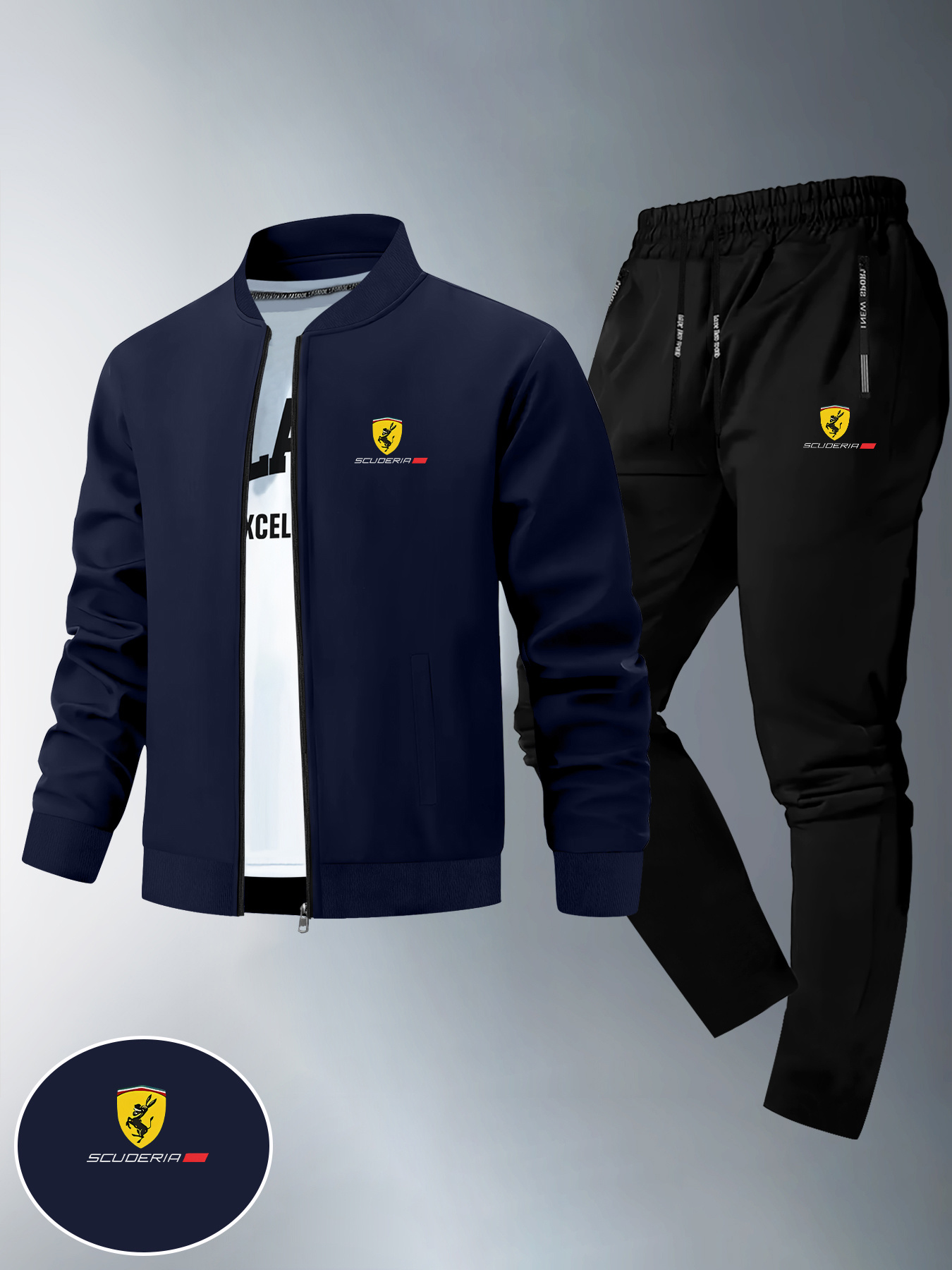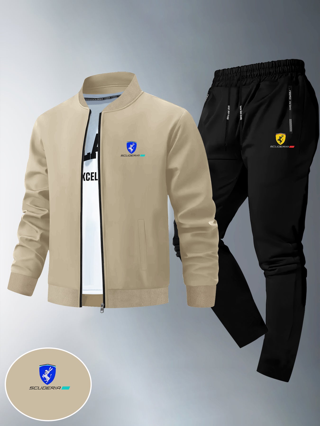 طقم من قطعتين يتكون من سترة ضيقة وبنطال رياضي طويل للرجال، يتميز بطبعات الفريق، ونمط بسحاب، مصنوع من قماش ناعم، مناسب للارتداء غير الرسمي في فصلي الخريف والشتاء.
