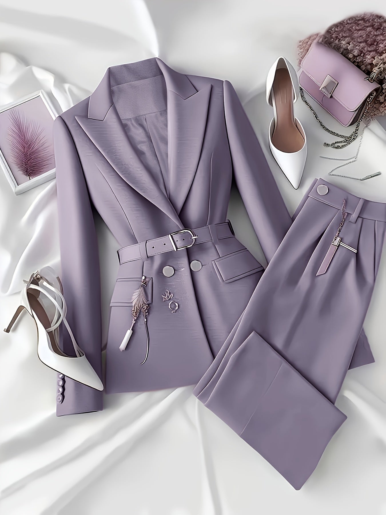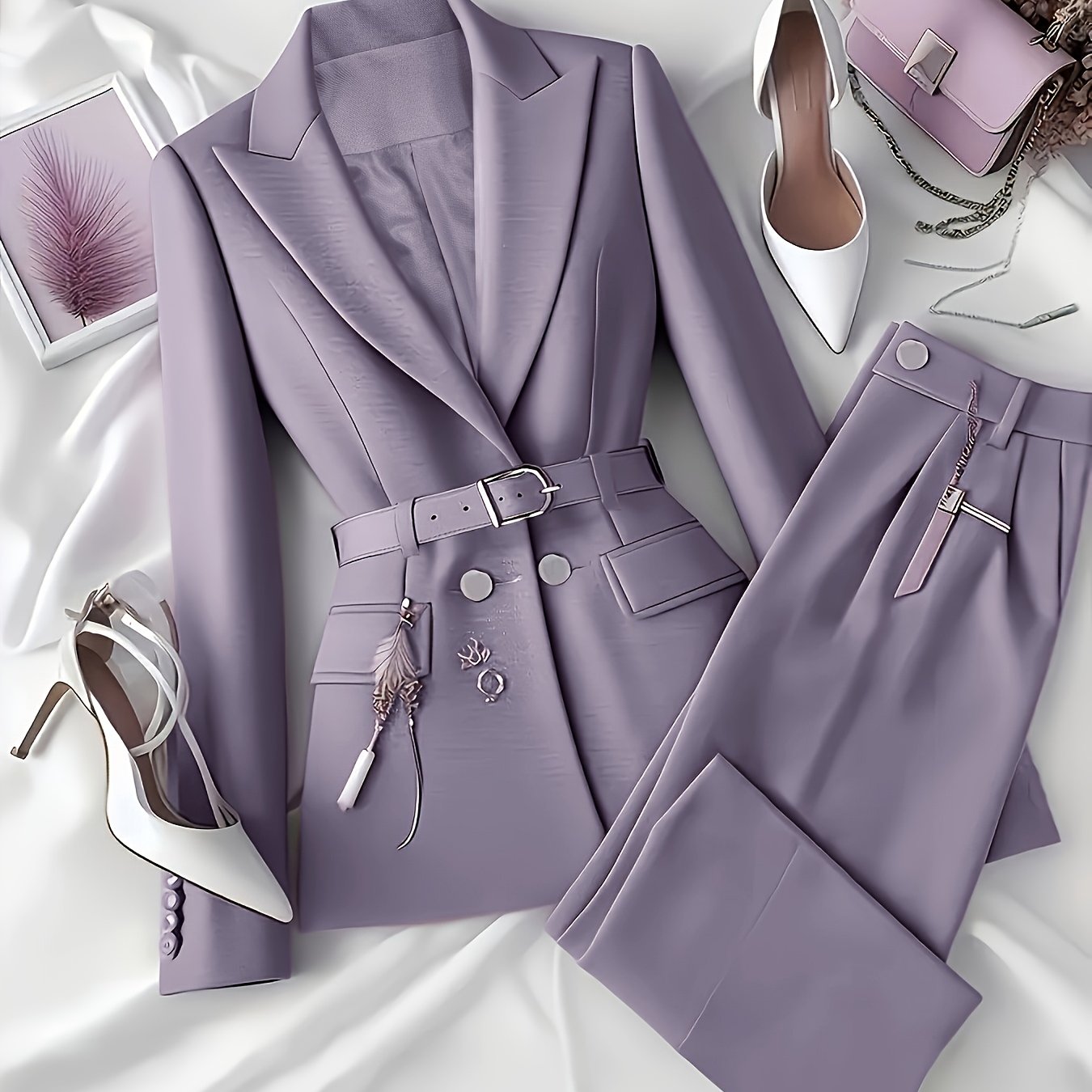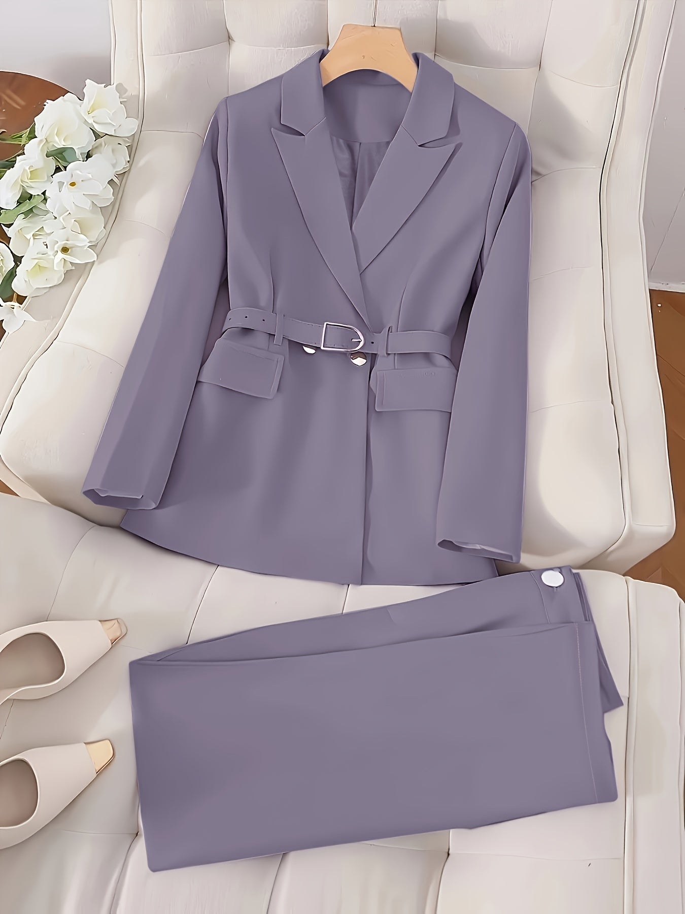 بدلة أنيقة بلون واحد من البليزر مع حزام وبنطال طويل - ملابس مكتب أنيقة لربيع/صيف للنساء مع جيوب