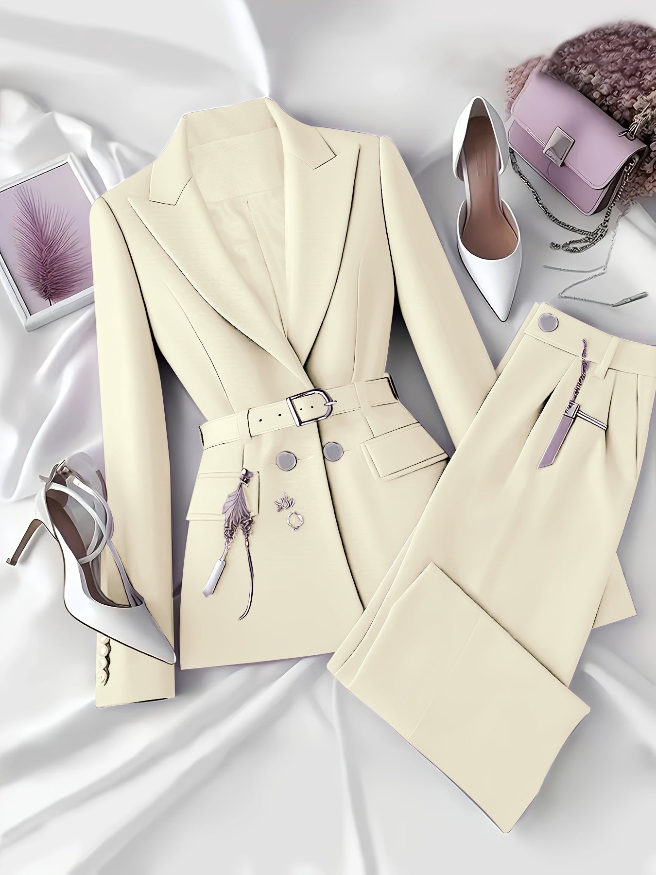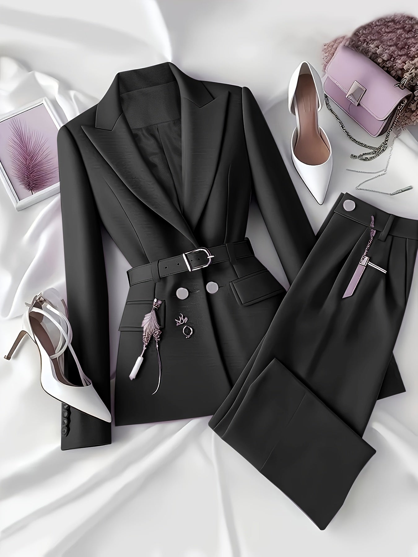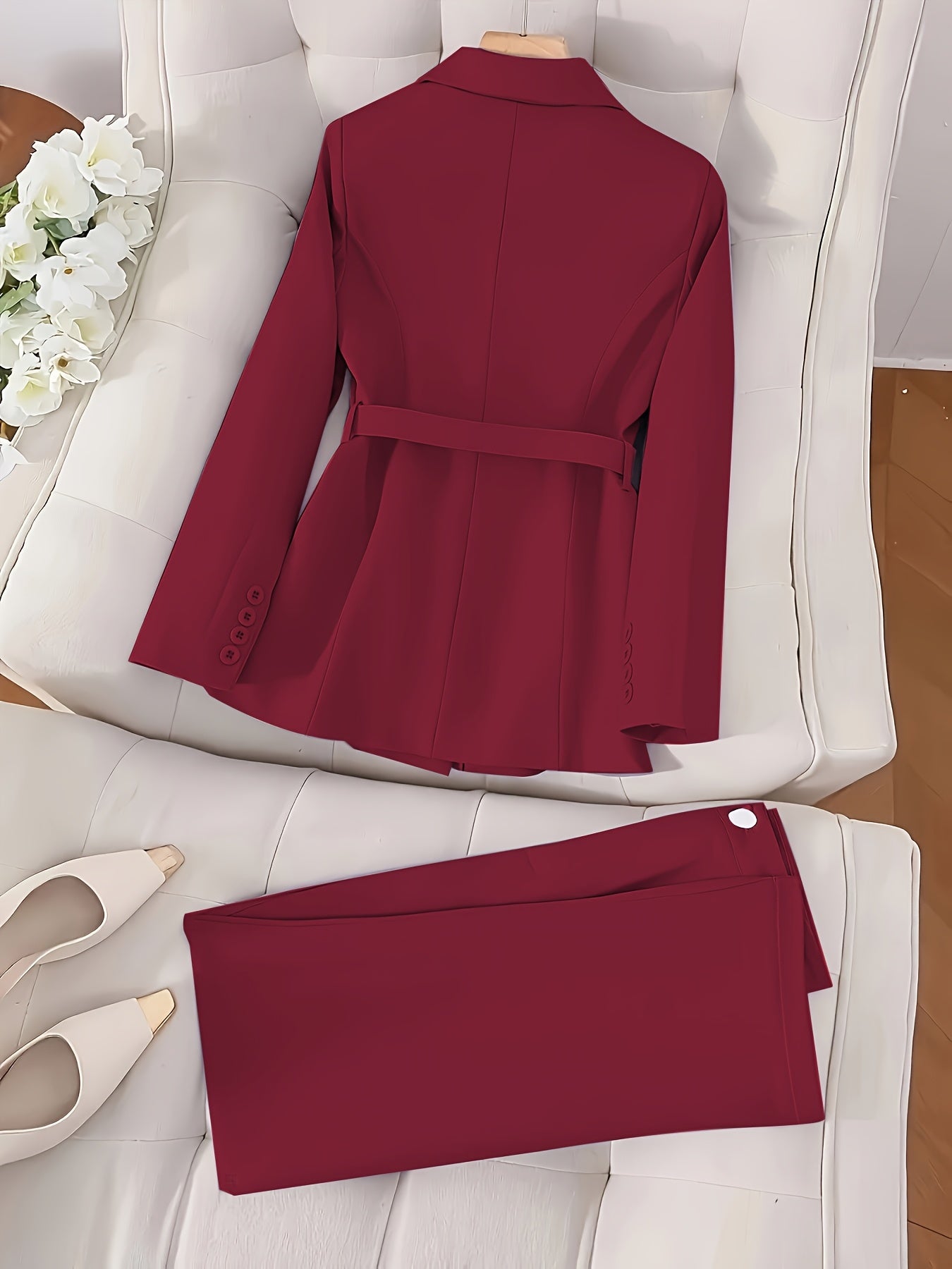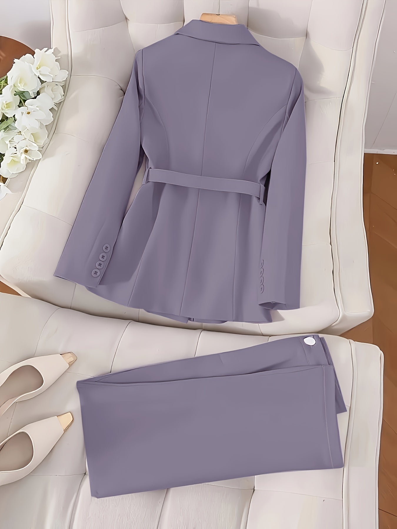 بدلة أنيقة بلون واحد من البليزر مع حزام وبنطال طويل - ملابس مكتب أنيقة لربيع/صيف للنساء مع جيوب