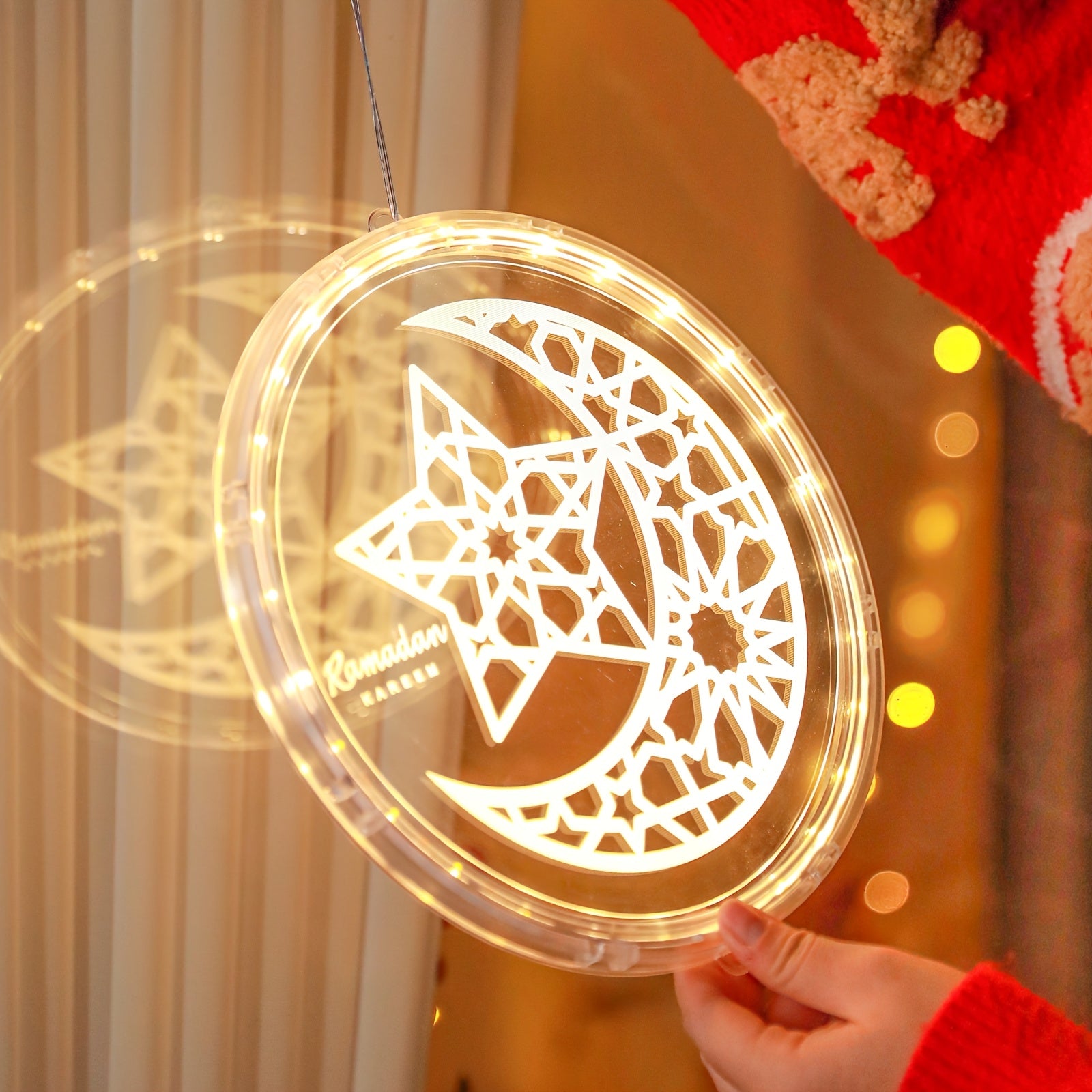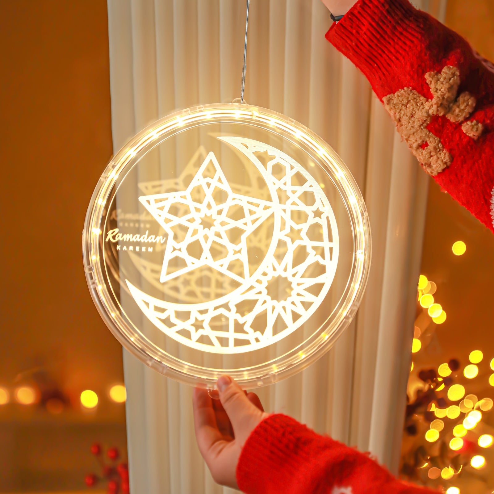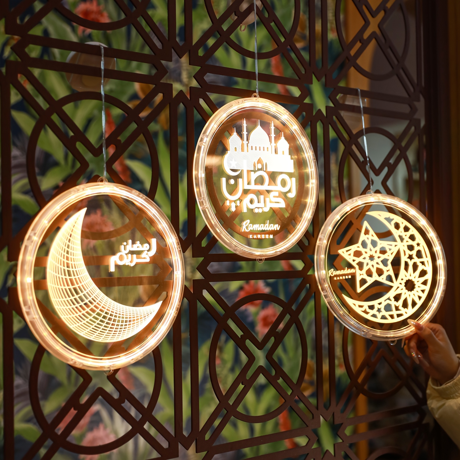 فوانيس رمضانية بتقنية LED - تصميم الخط العربي والهلال، تعمل بالبطارية، مصابيح معلقة داخلية/خارجية مع زر تحكم، فوانيس زخرفية