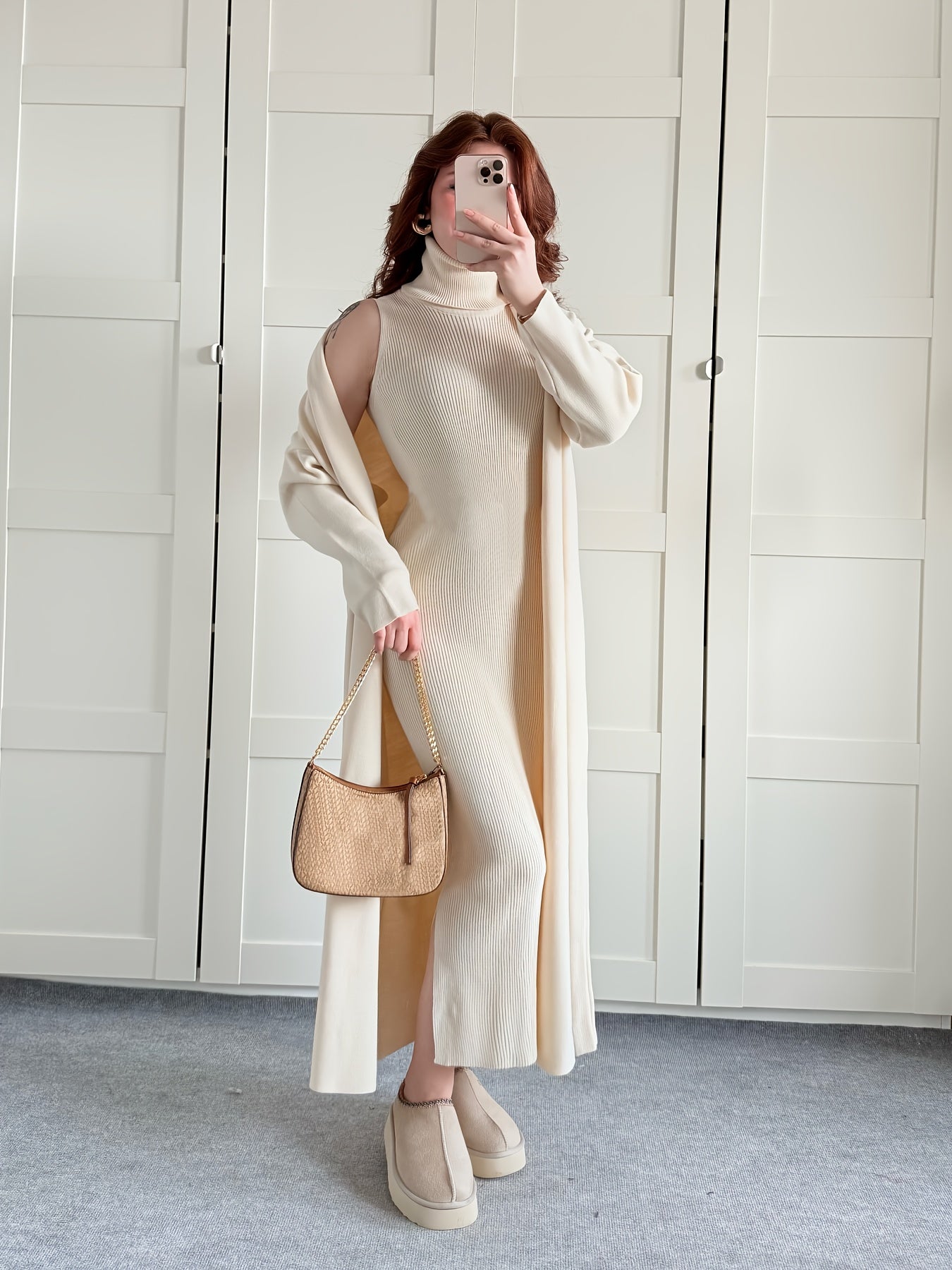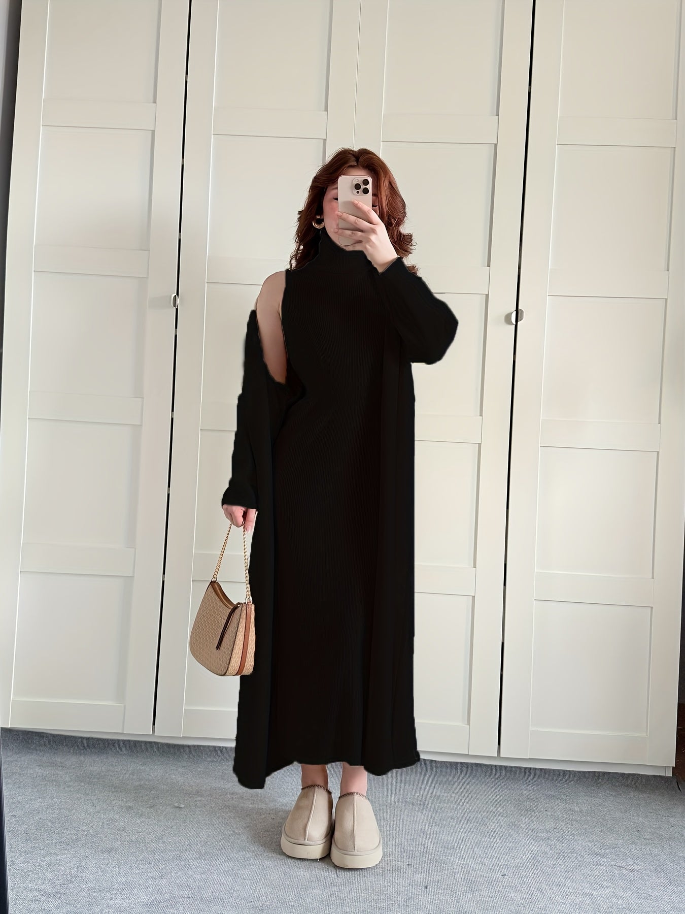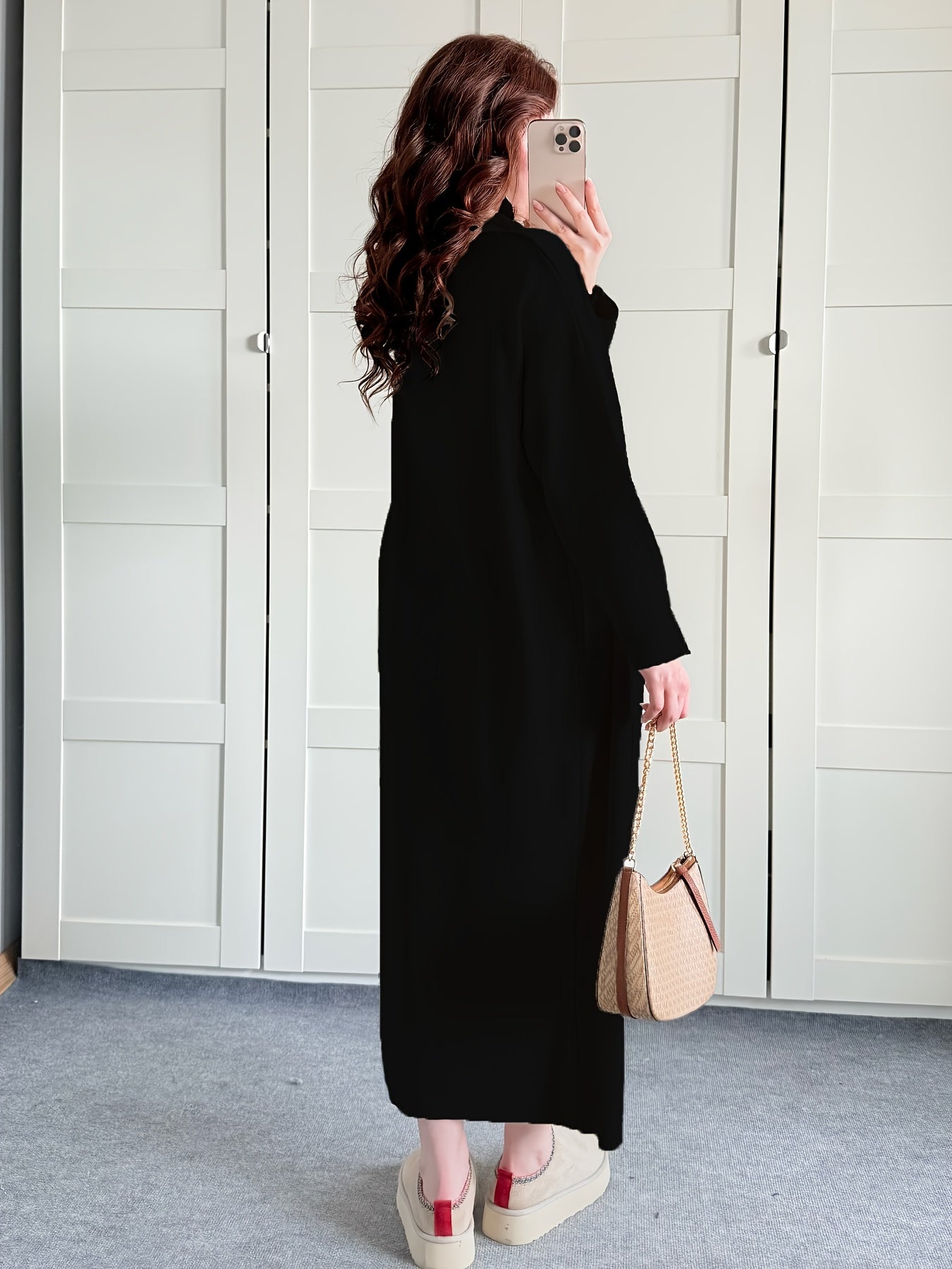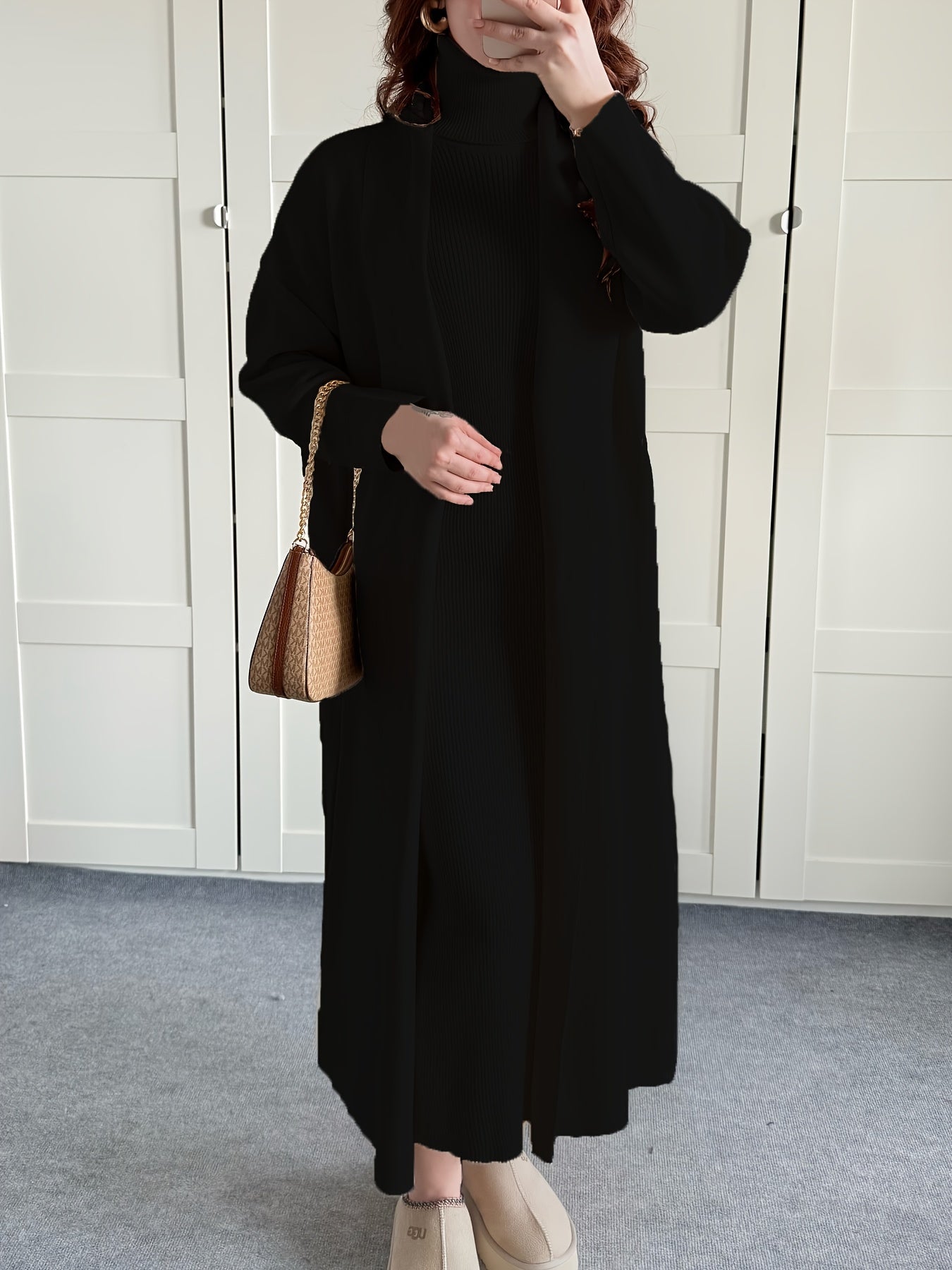 طقم نسائي أنيق لفصل الخريف والشتاء، مكون من جاكيت بأكمام طويلة وفتحة رقبة مستديرة، بلون سادة