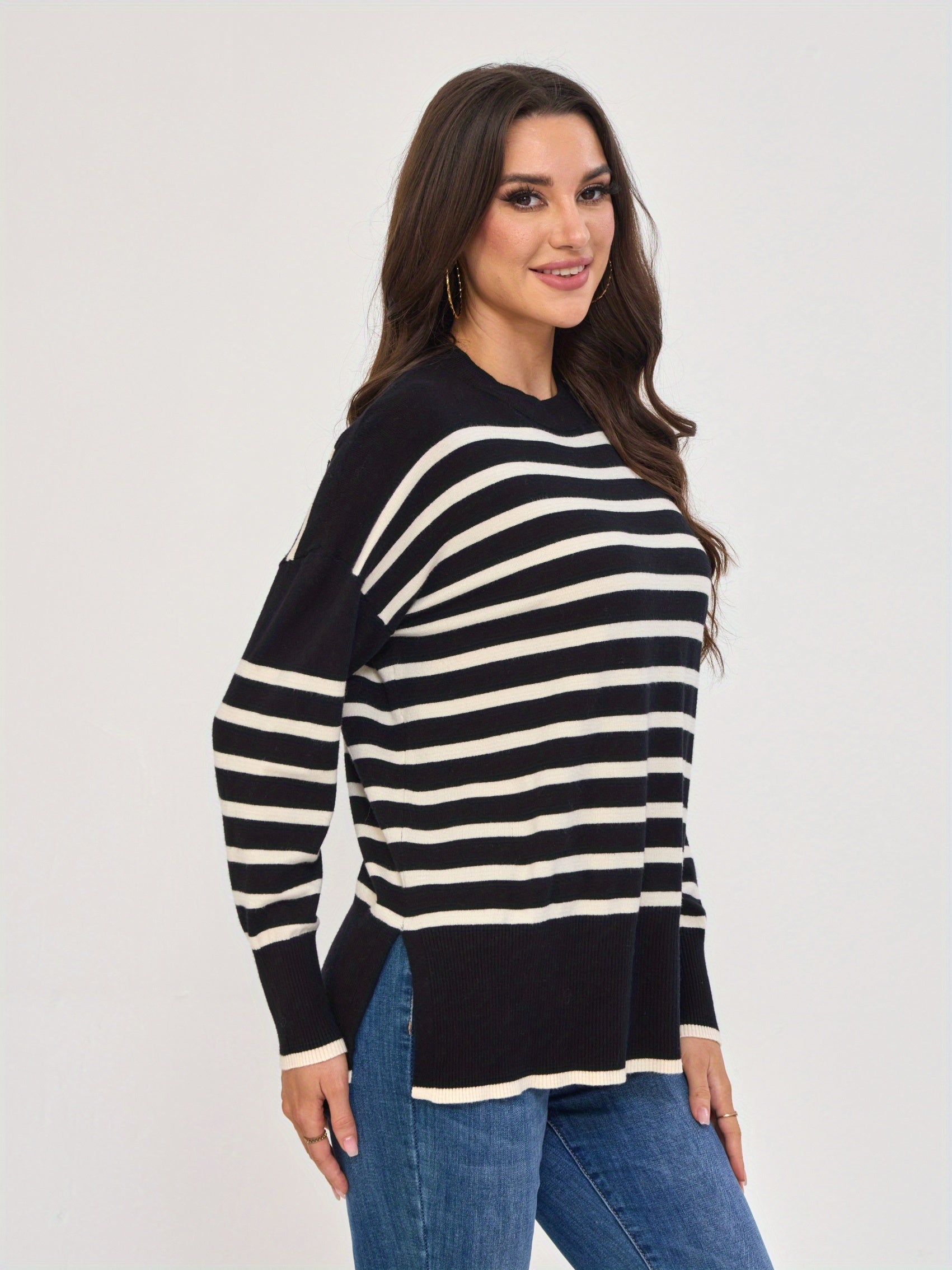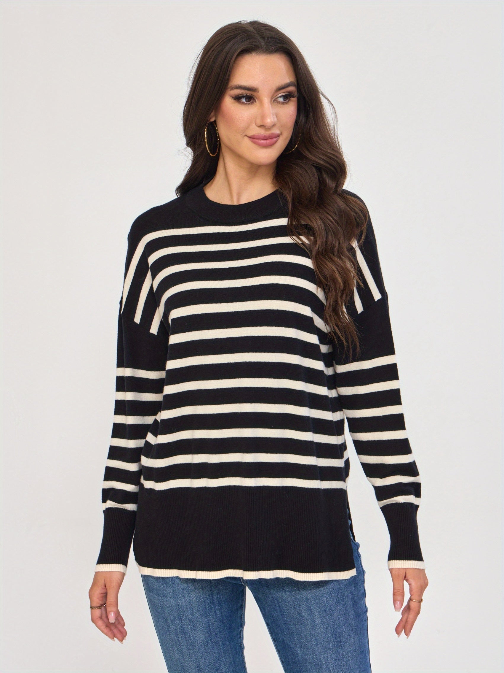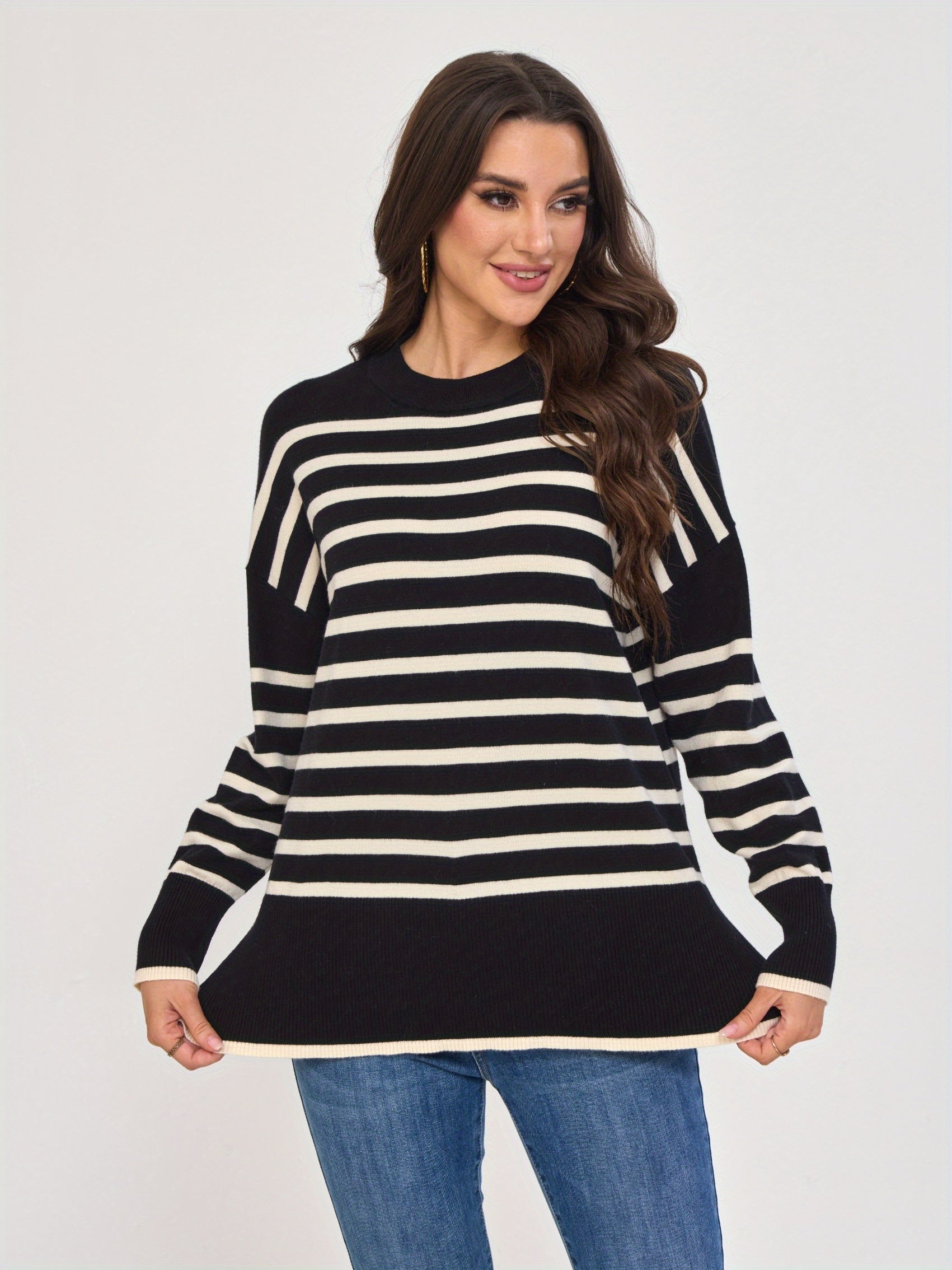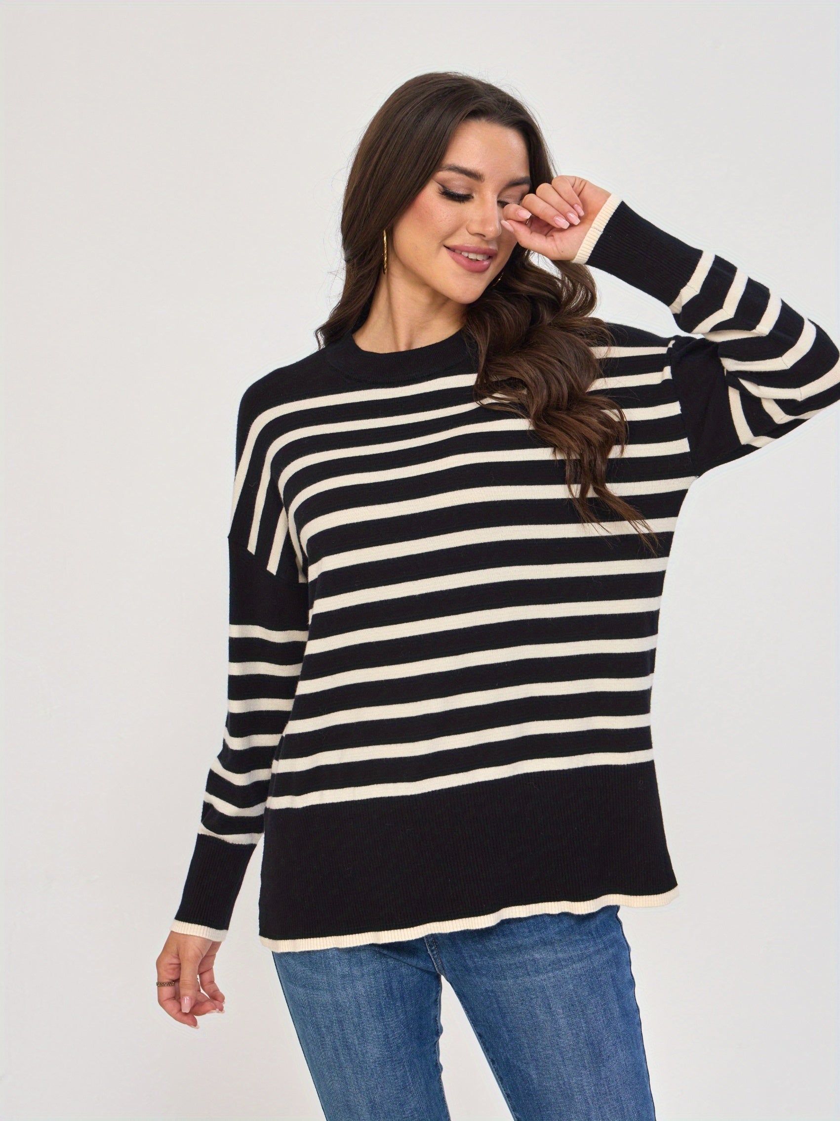 سترة نسائية شتوية دافئة مخططة - بلوزة محبوكة بأكمام طويلة ورقبة دائرية باللونين الأسود والأبيض، سترة أنيقة قابلة للتمدد مع الجينز والسراويل الضيقة
