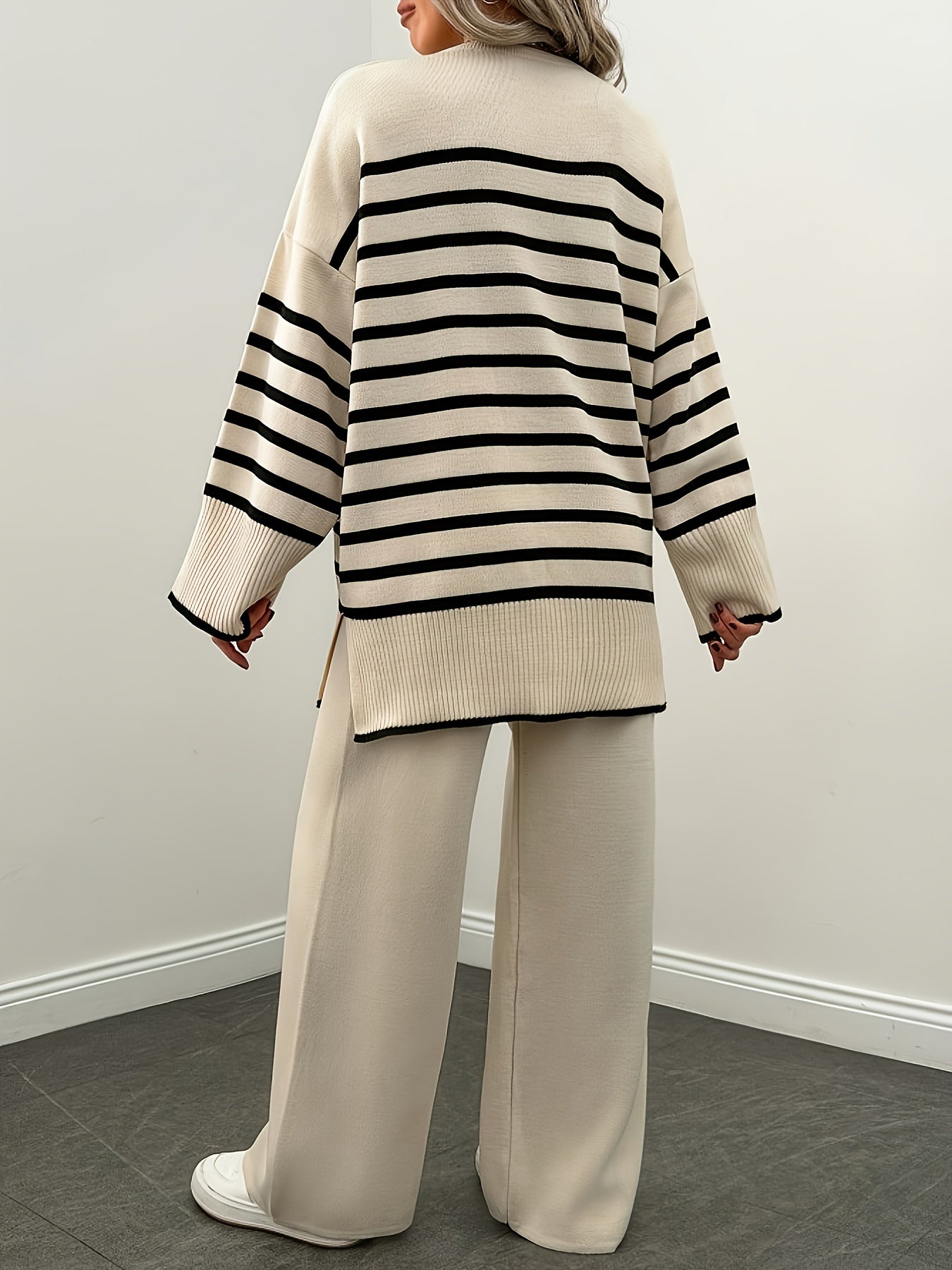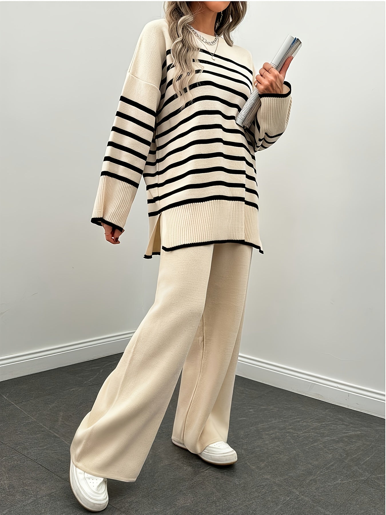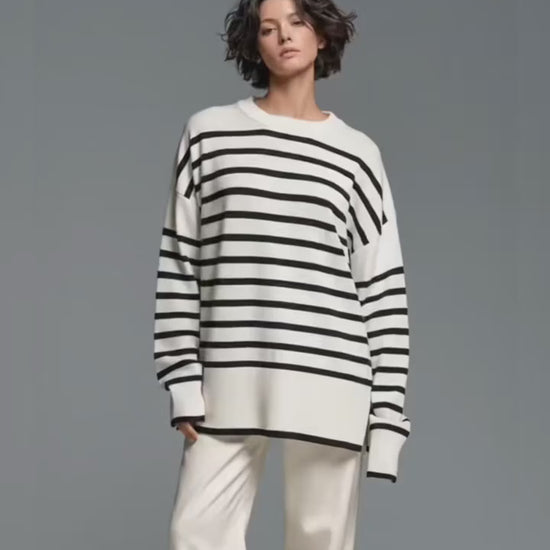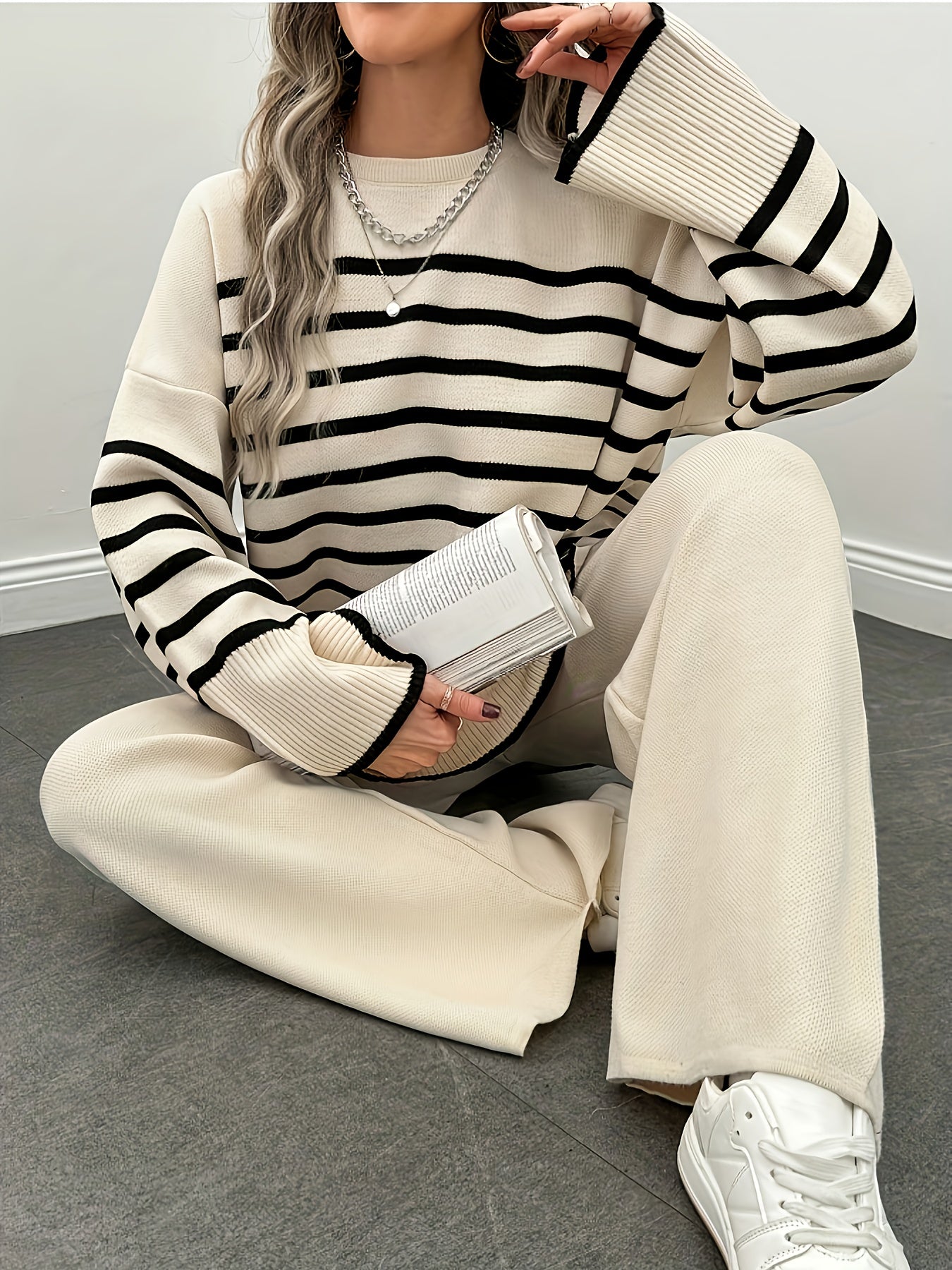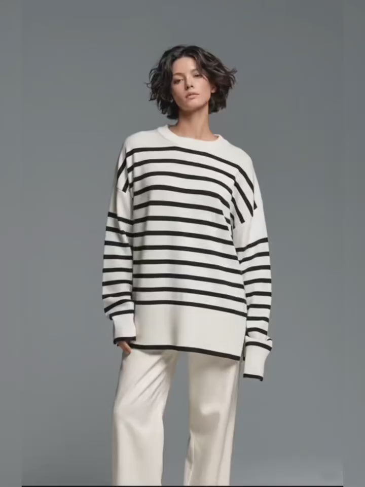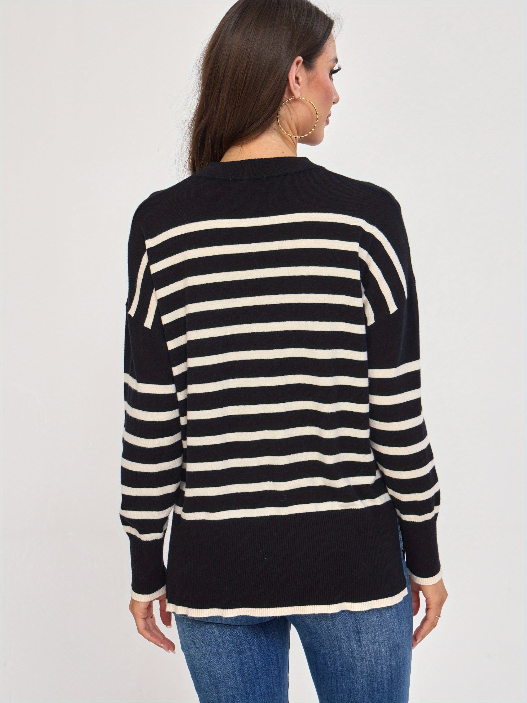 سترة نسائية شتوية دافئة مخططة - بلوزة محبوكة بأكمام طويلة ورقبة دائرية باللونين الأسود والأبيض، سترة أنيقة قابلة للتمدد مع الجينز والسراويل الضيقة