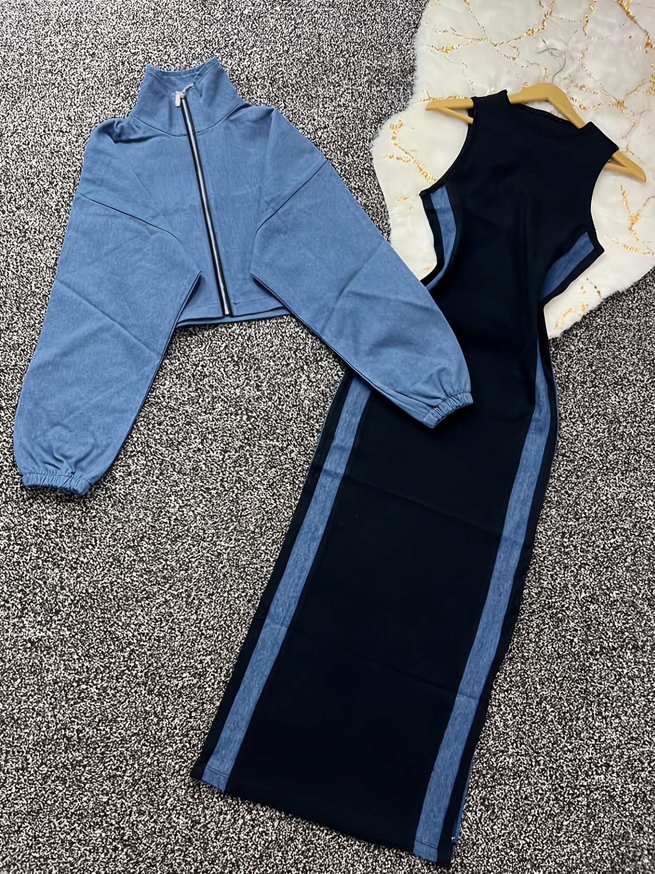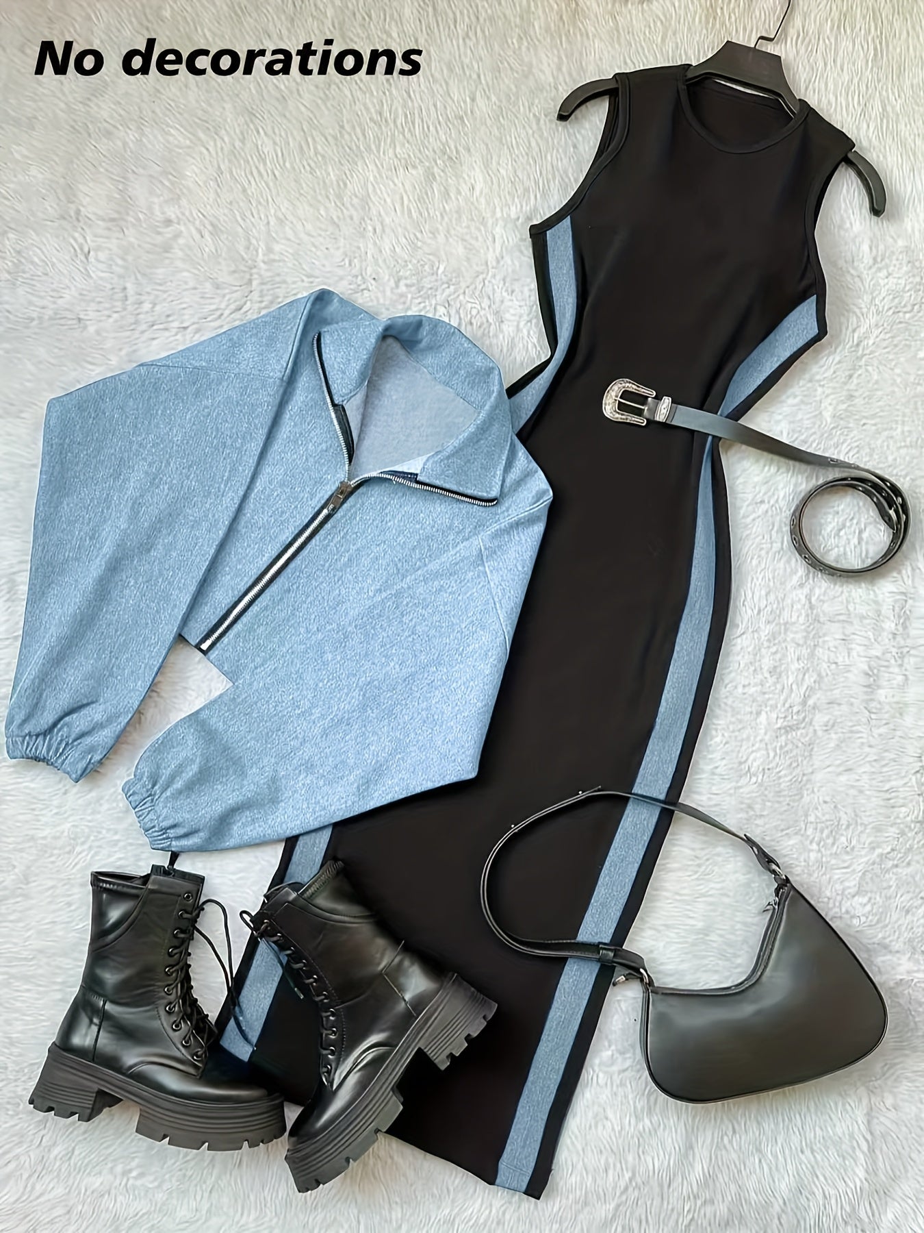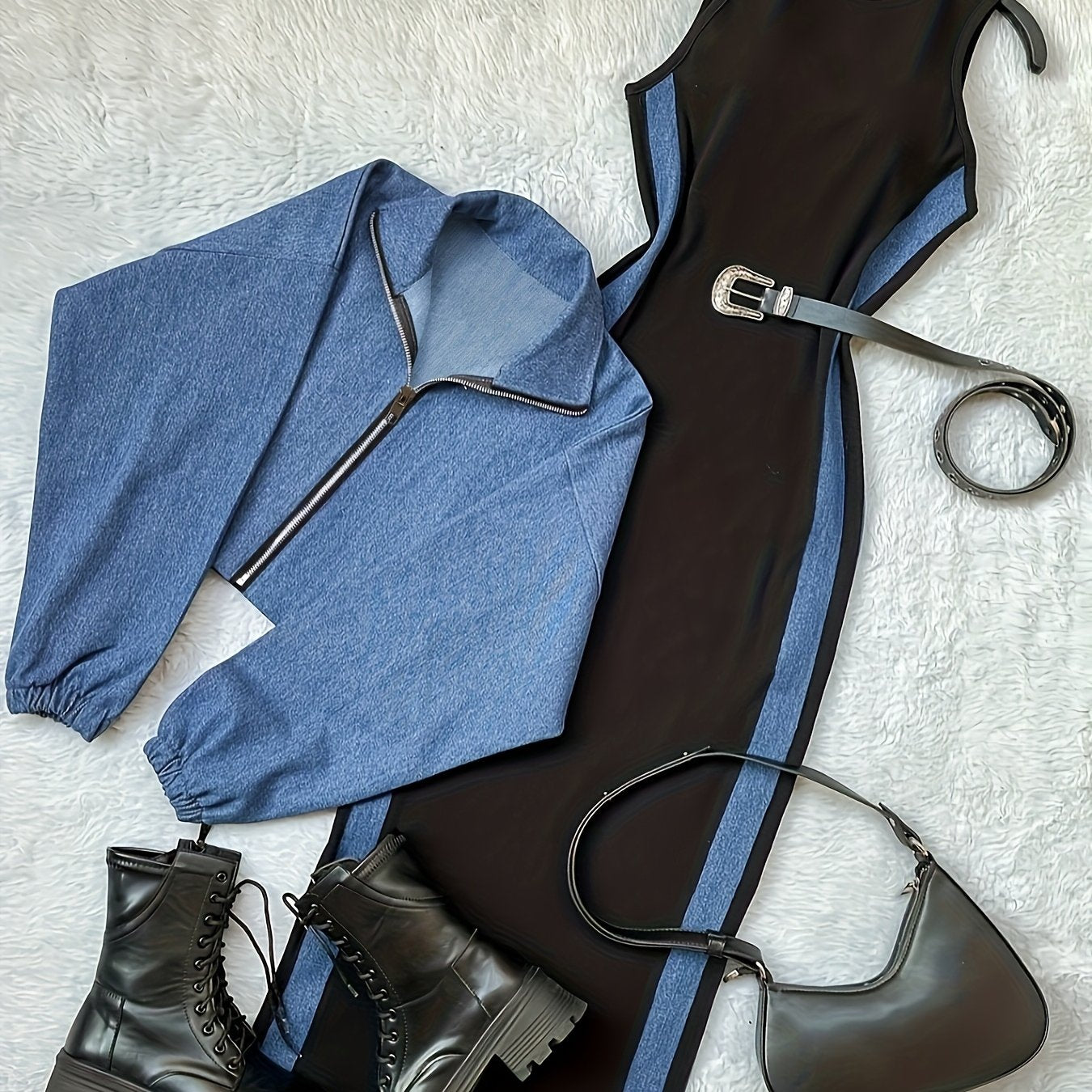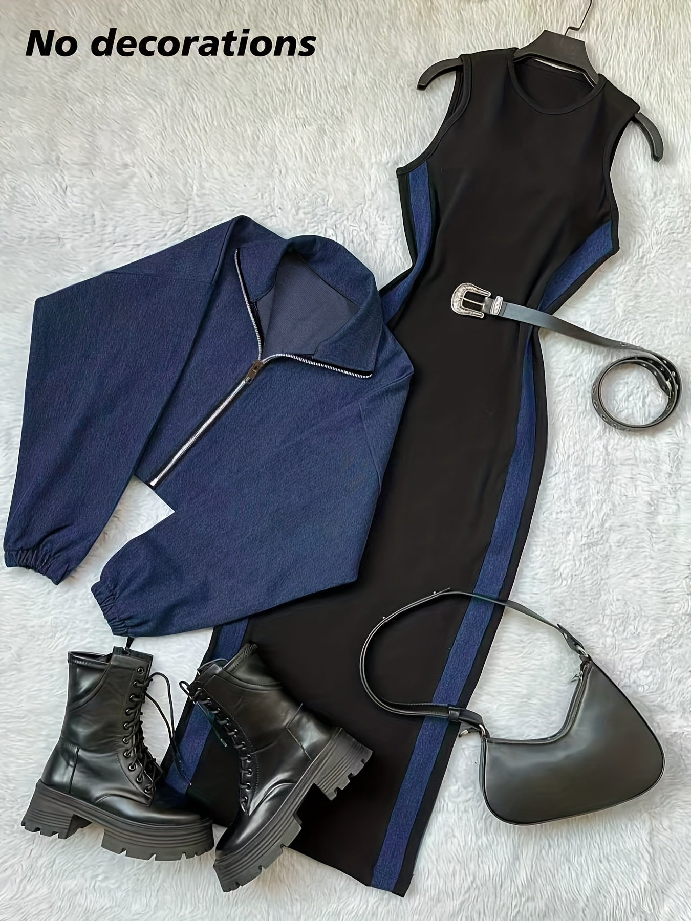 طقم بليزر وفستان نسائي من مجموعة Y2K بألوان متعددة - جاكيت أزرق بأكمام طويلة وسحاب مع فستان بيج بدون أكمام بقصة ضيقة، مناسب للمكتب والشارع في الربيع/الخريف