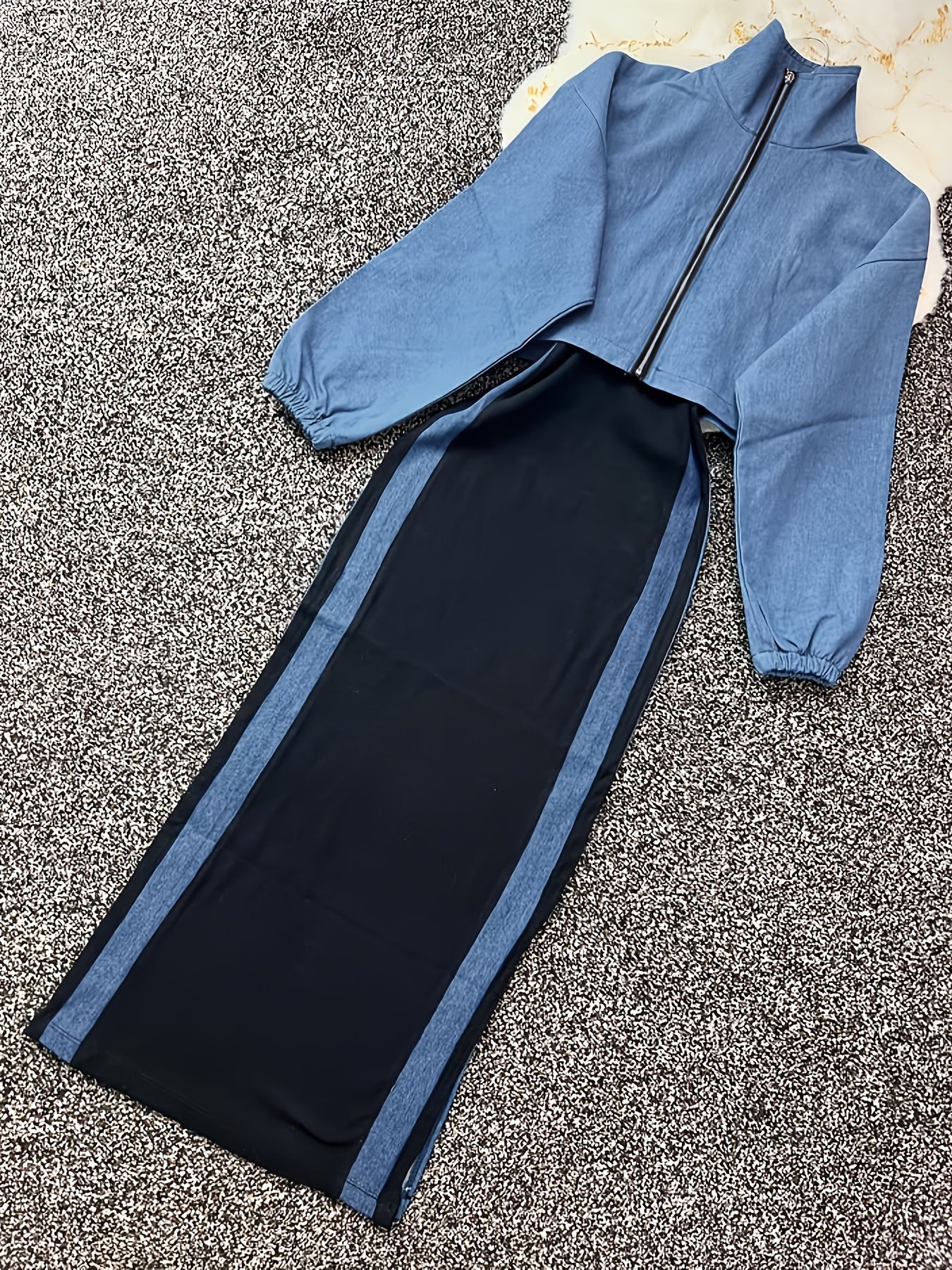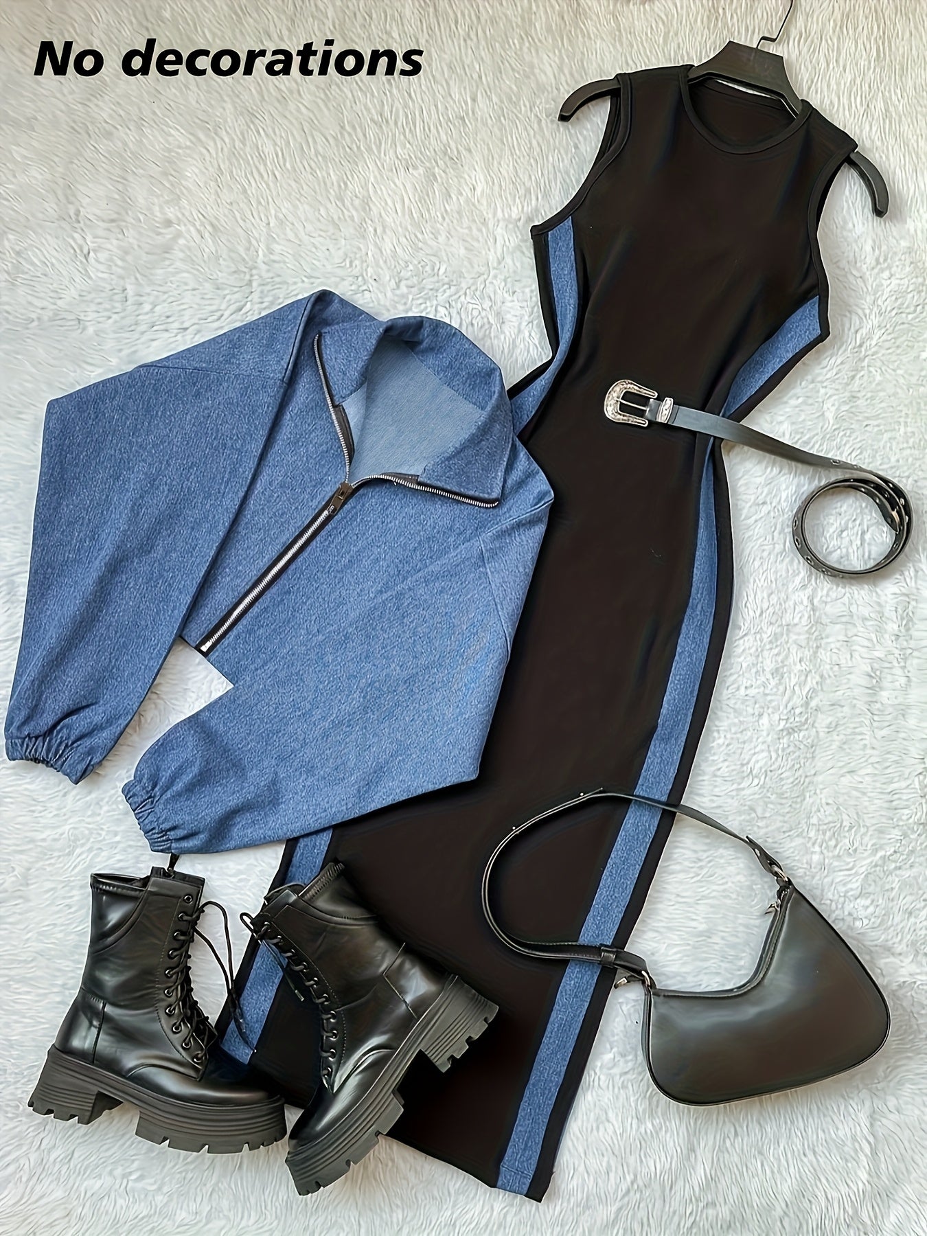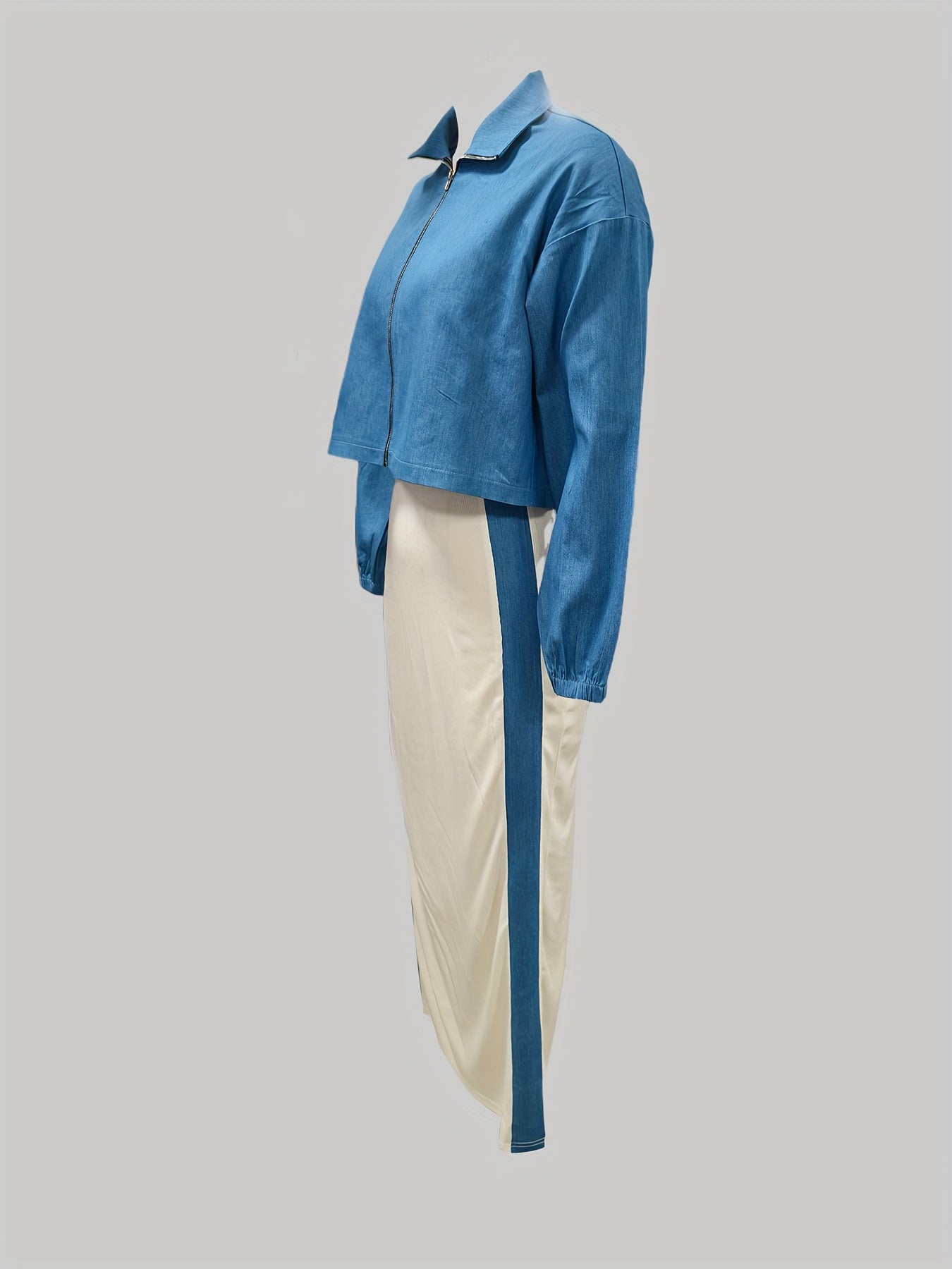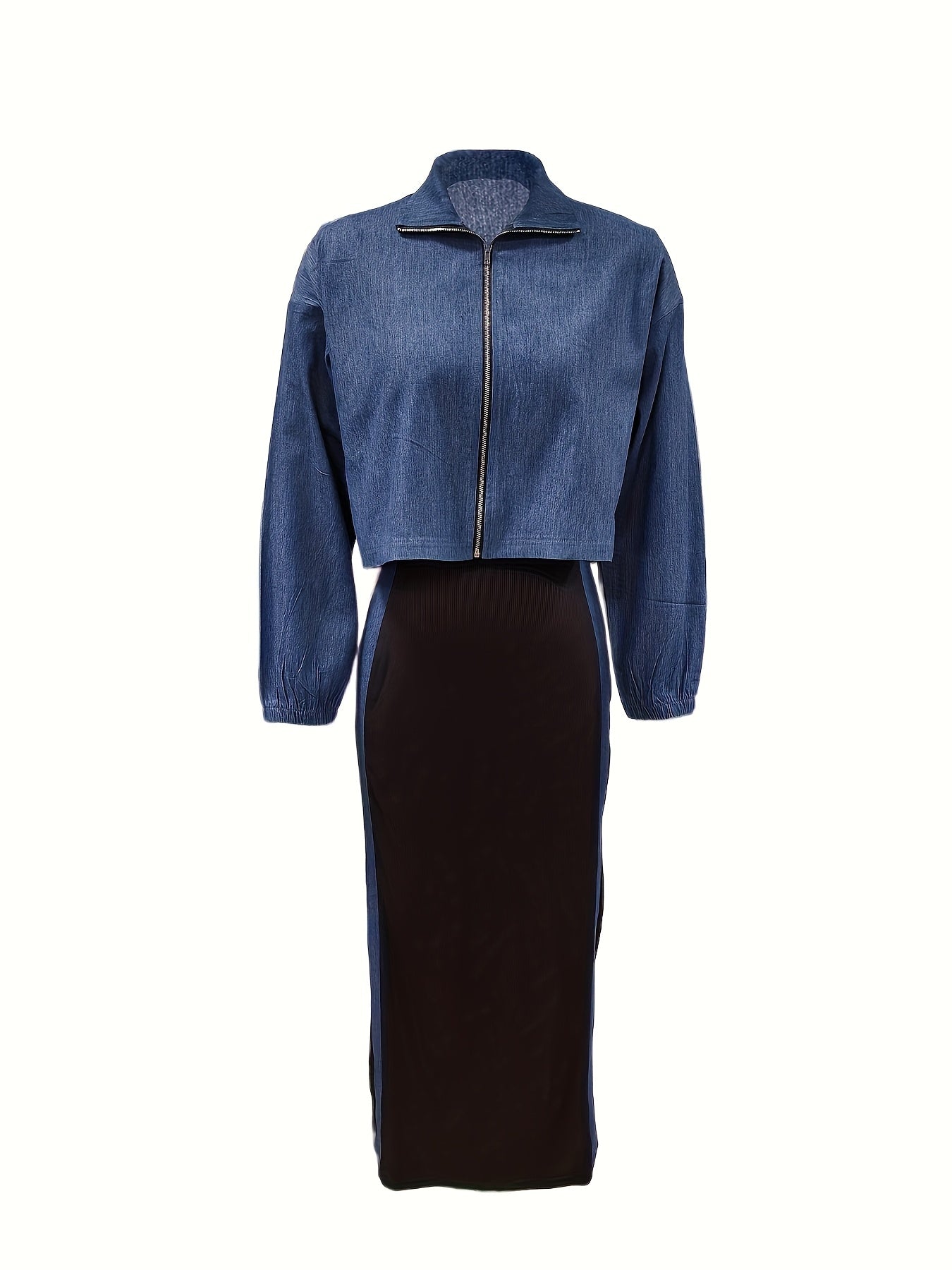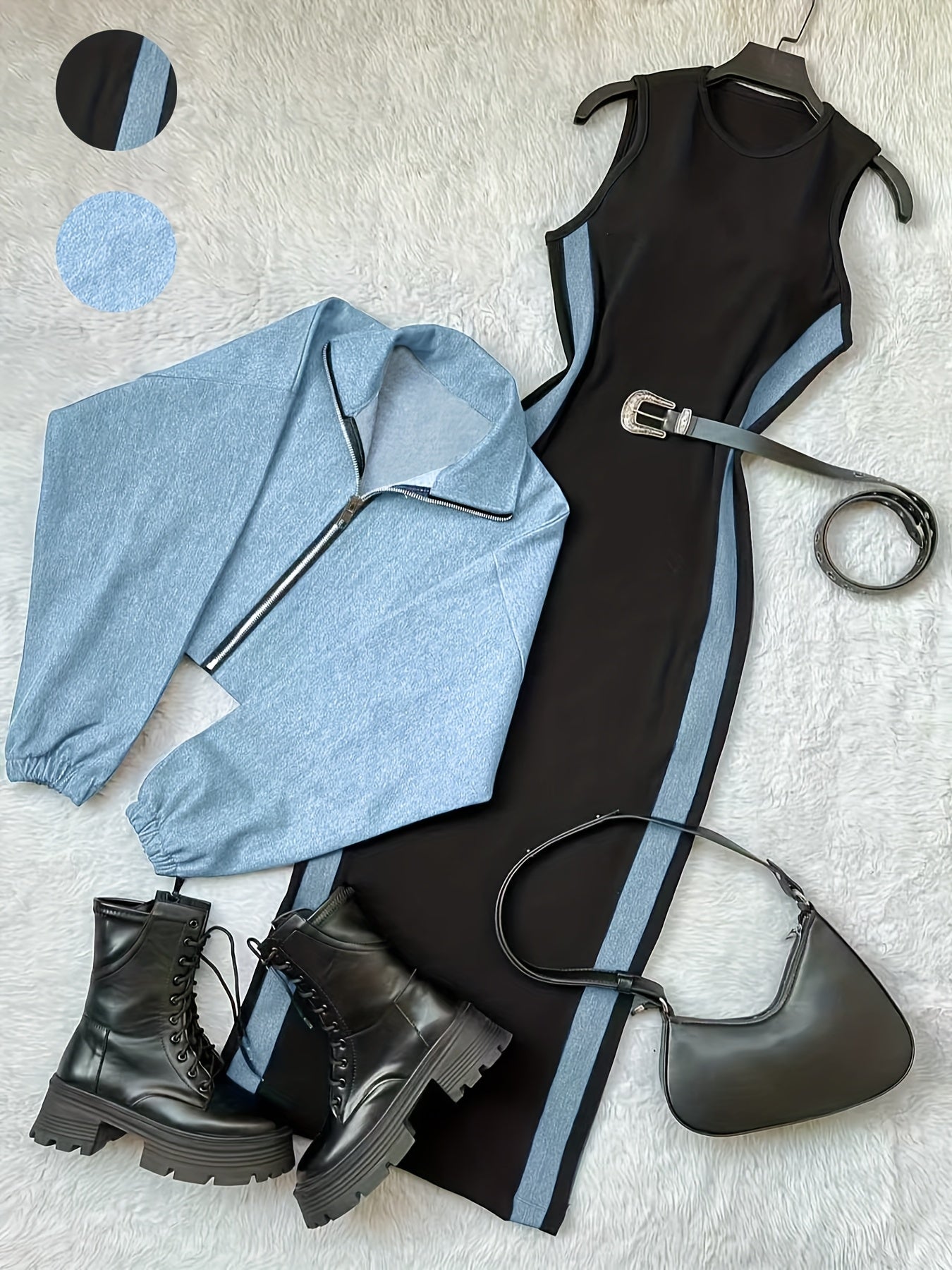 طقم بليزر وفستان نسائي من مجموعة Y2K بألوان متعددة - جاكيت أزرق بأكمام طويلة وسحاب مع فستان بيج بدون أكمام بقصة ضيقة، مناسب للمكتب والشارع في الربيع/الخريف