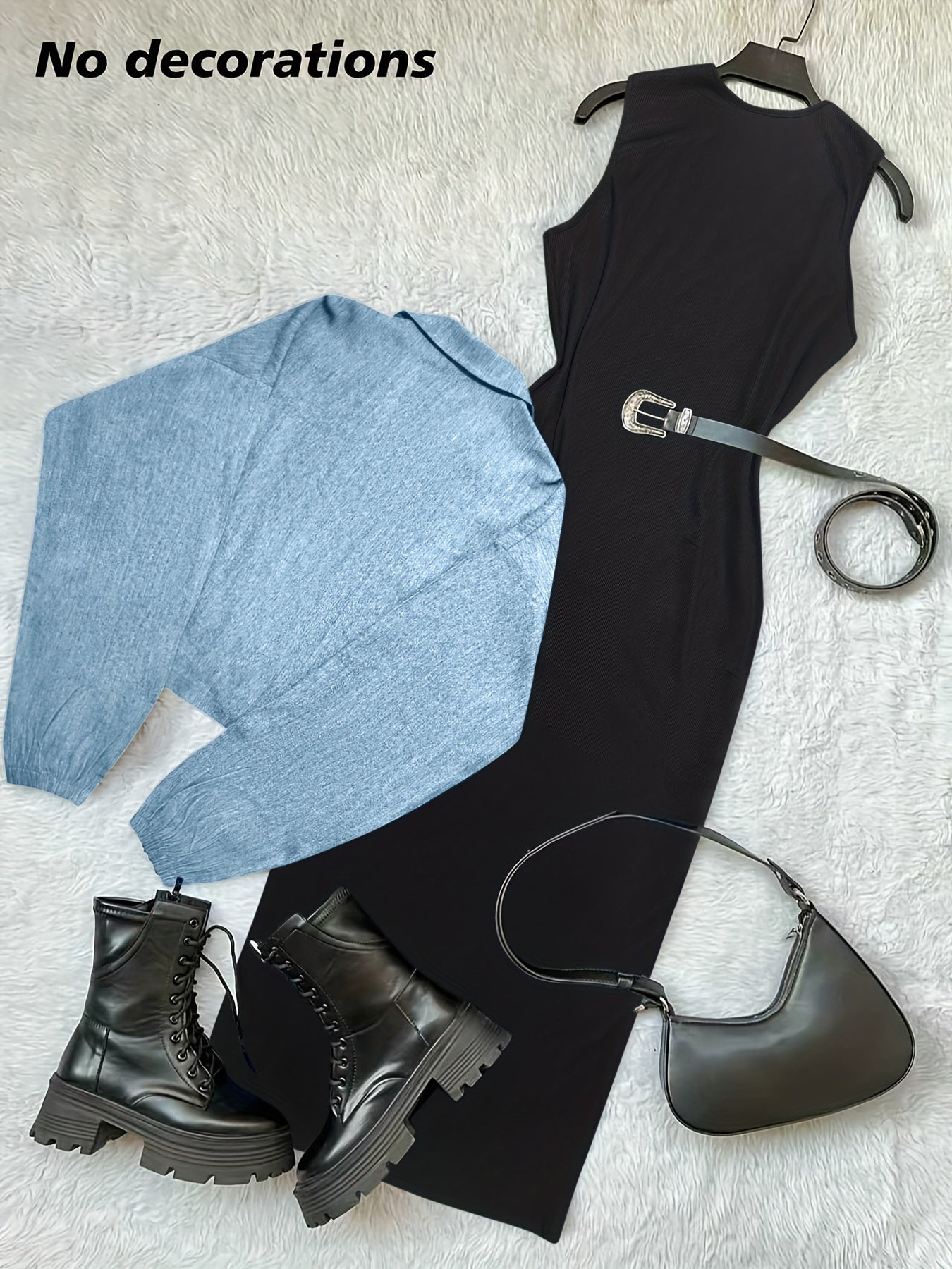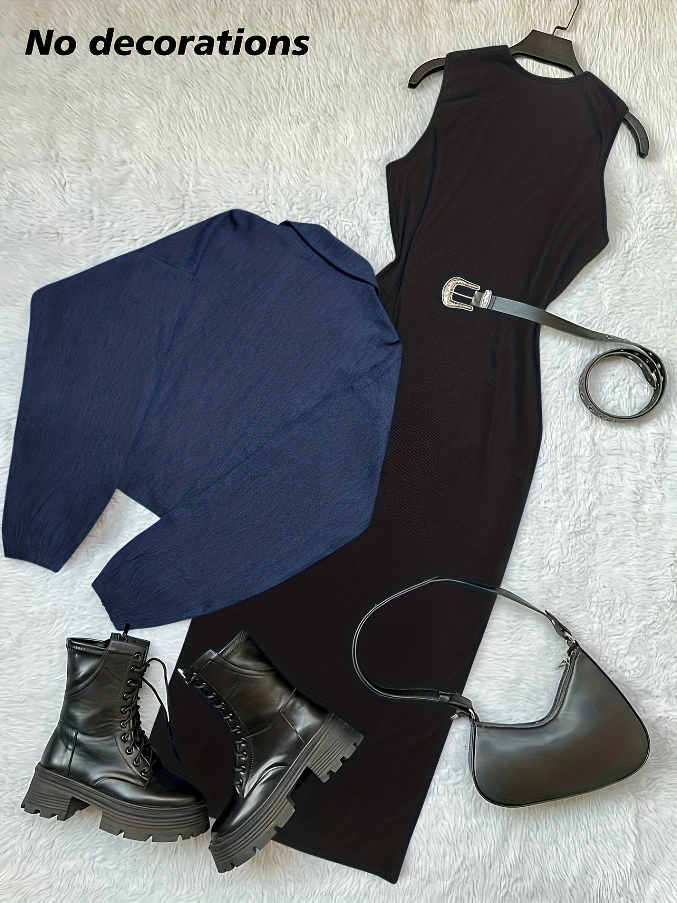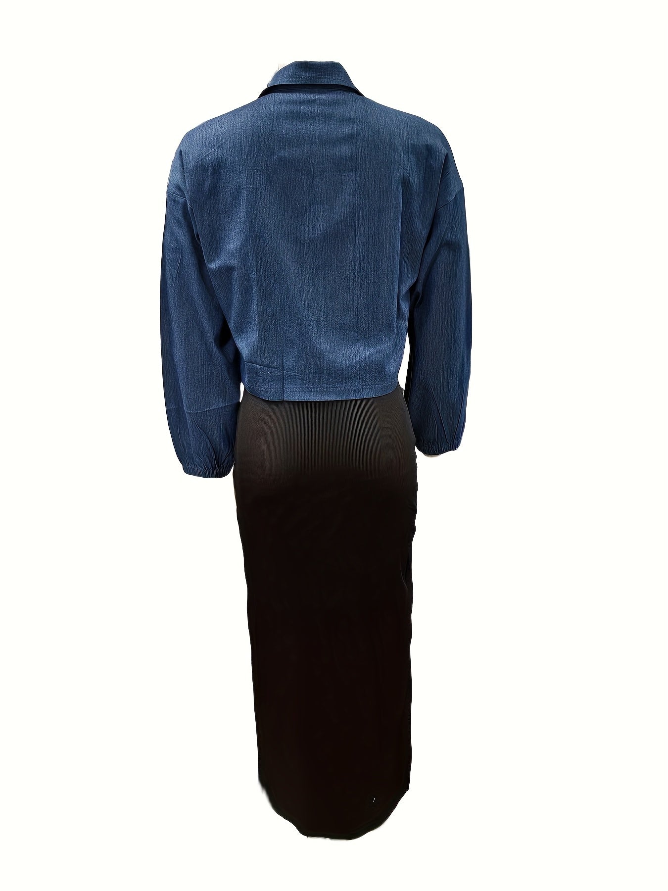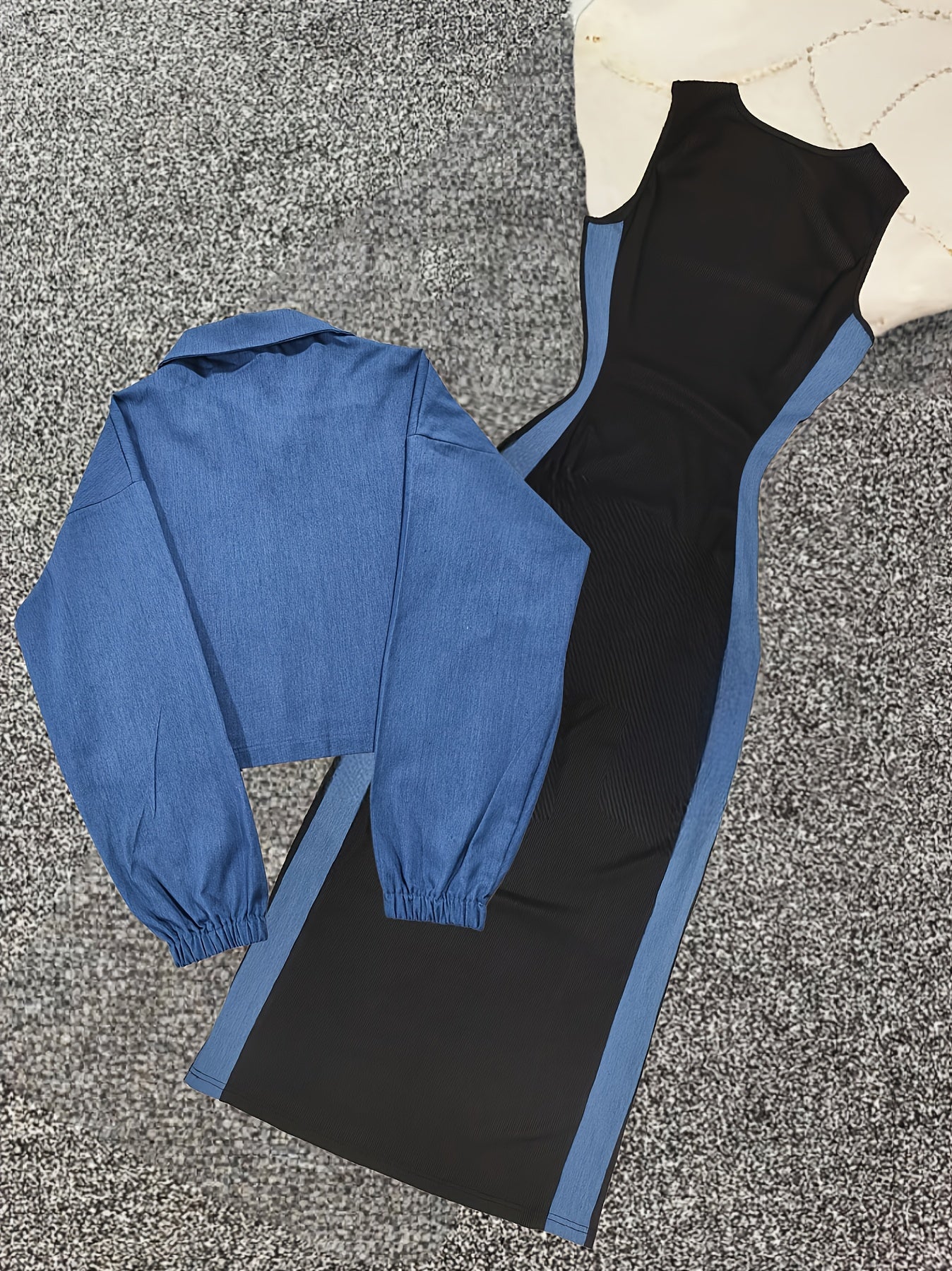 طقم بليزر وفستان نسائي من مجموعة Y2K بألوان متعددة - جاكيت أزرق بأكمام طويلة وسحاب مع فستان بيج بدون أكمام بقصة ضيقة، مناسب للمكتب والشارع في الربيع/الخريف