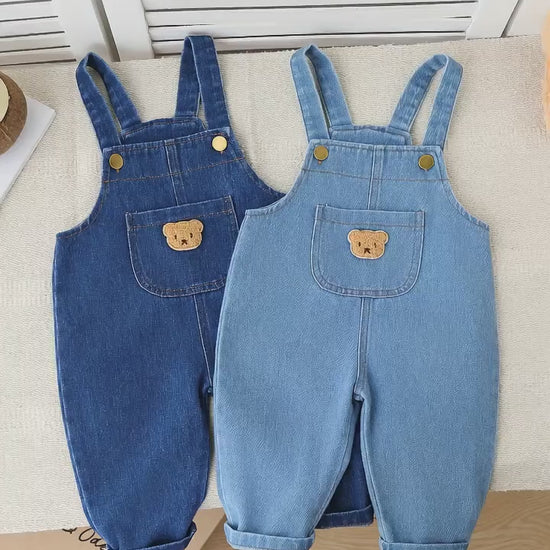 2-Piece Baby Boys’ Faux Denim Overalls – Adjustable Strap Rompers with Cute Bear Pockets, Regular-Fit All-Season Outfit for Outdoor Play