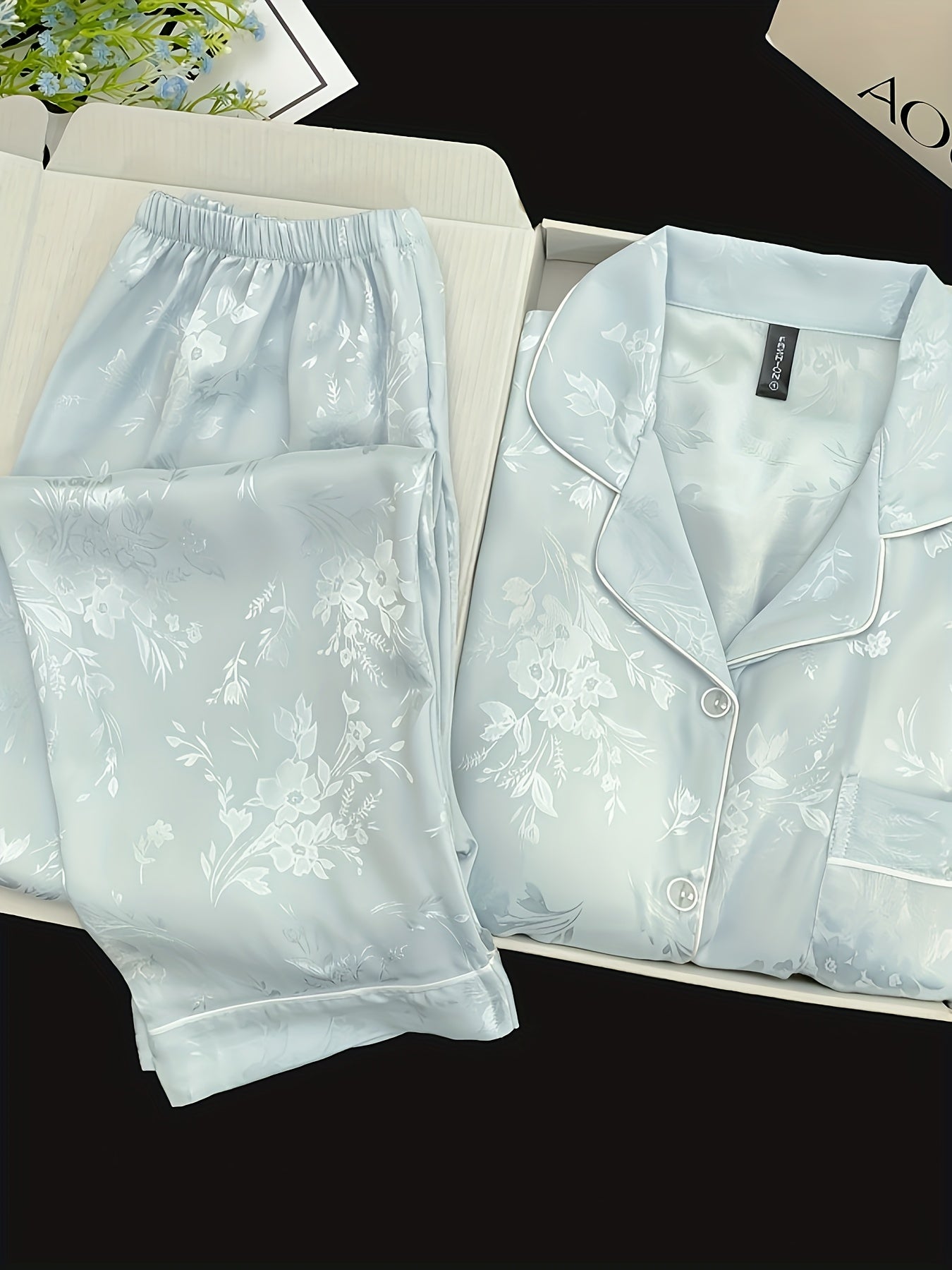 2025 Women’s Ice-Silky Fiber Two-Piece Set – Lightweight Long-Sleeve Top with Chest Pad & Loose Pants, Soft Summer Home Wear in Blue