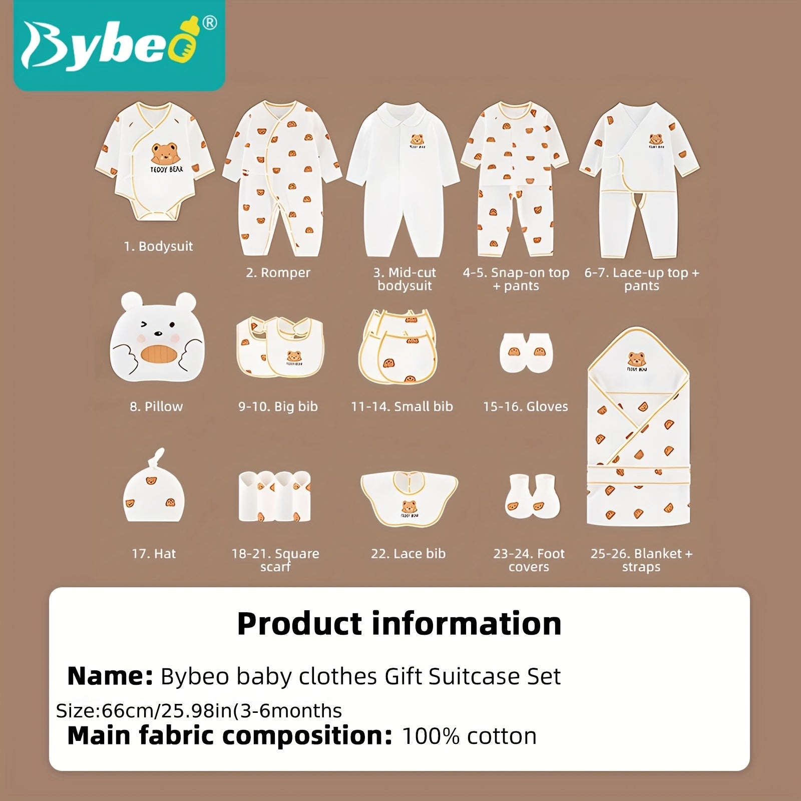 26-Piece Newborn Baby Clothing & Accessories Set – Soft Cotton White/Beige Layette with Brown Bear Designs, All-Season Unisex Gift Collection