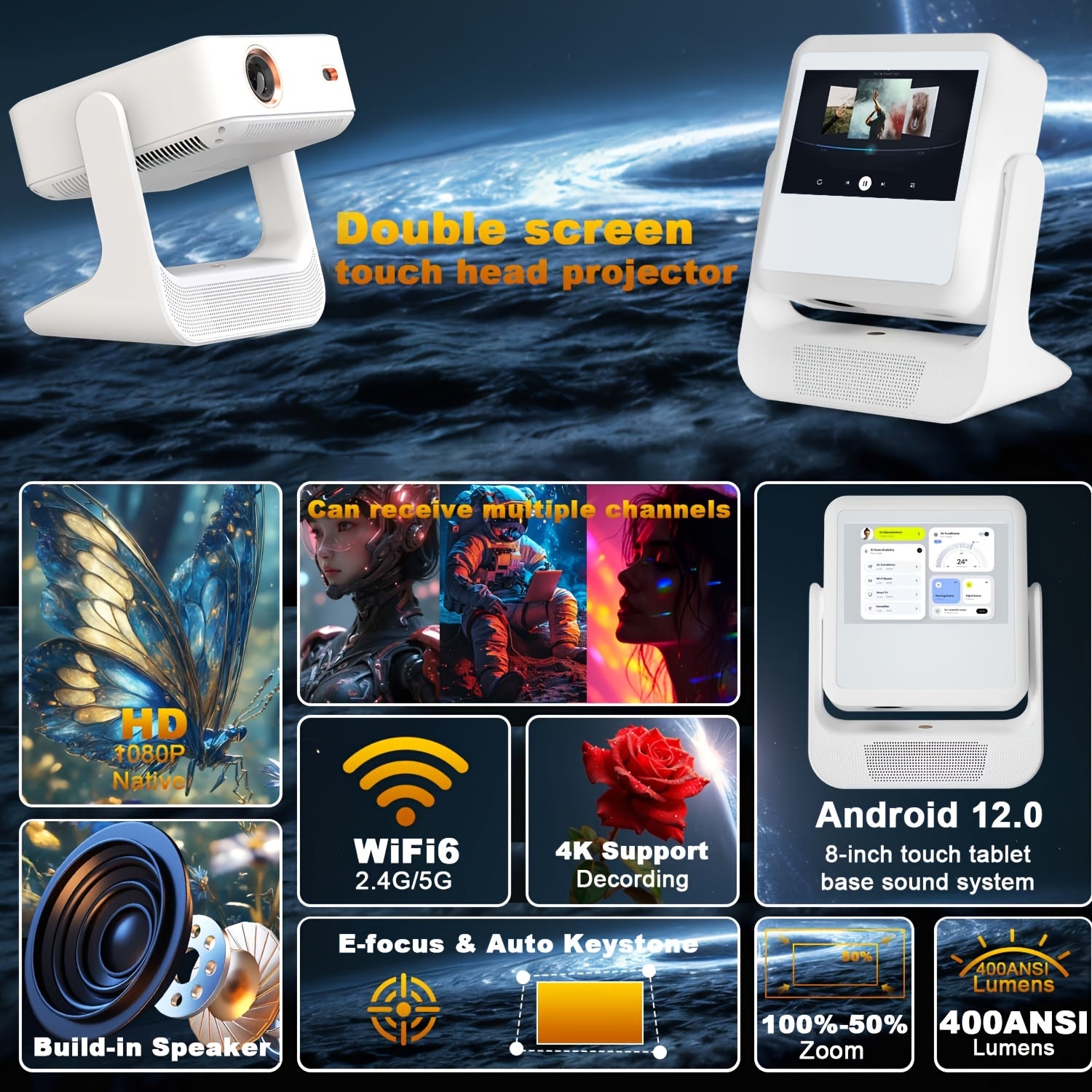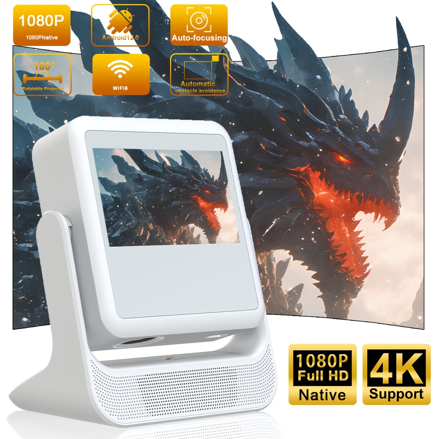 A2Pro Smart ProjectorNative 1080P resolution, 4K support, built-in For Android 12. Features an 8" touchscreen for easy control, WiFi 6 for fast streaming, plus auto focus and auto keystone correction. Enjoy smooth performance, clear image quality, and app-friendly usability. Perfect for movies, games, work, and more.
