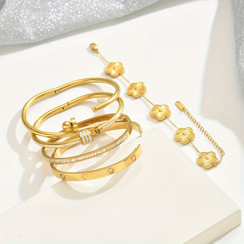 ACNODE 5-Piece 18K Gold-Plated Stainless Steel Boho Bracelet Set – Sparkling Rhinestone Bangles for Festivals & Daily Luxury Wear
