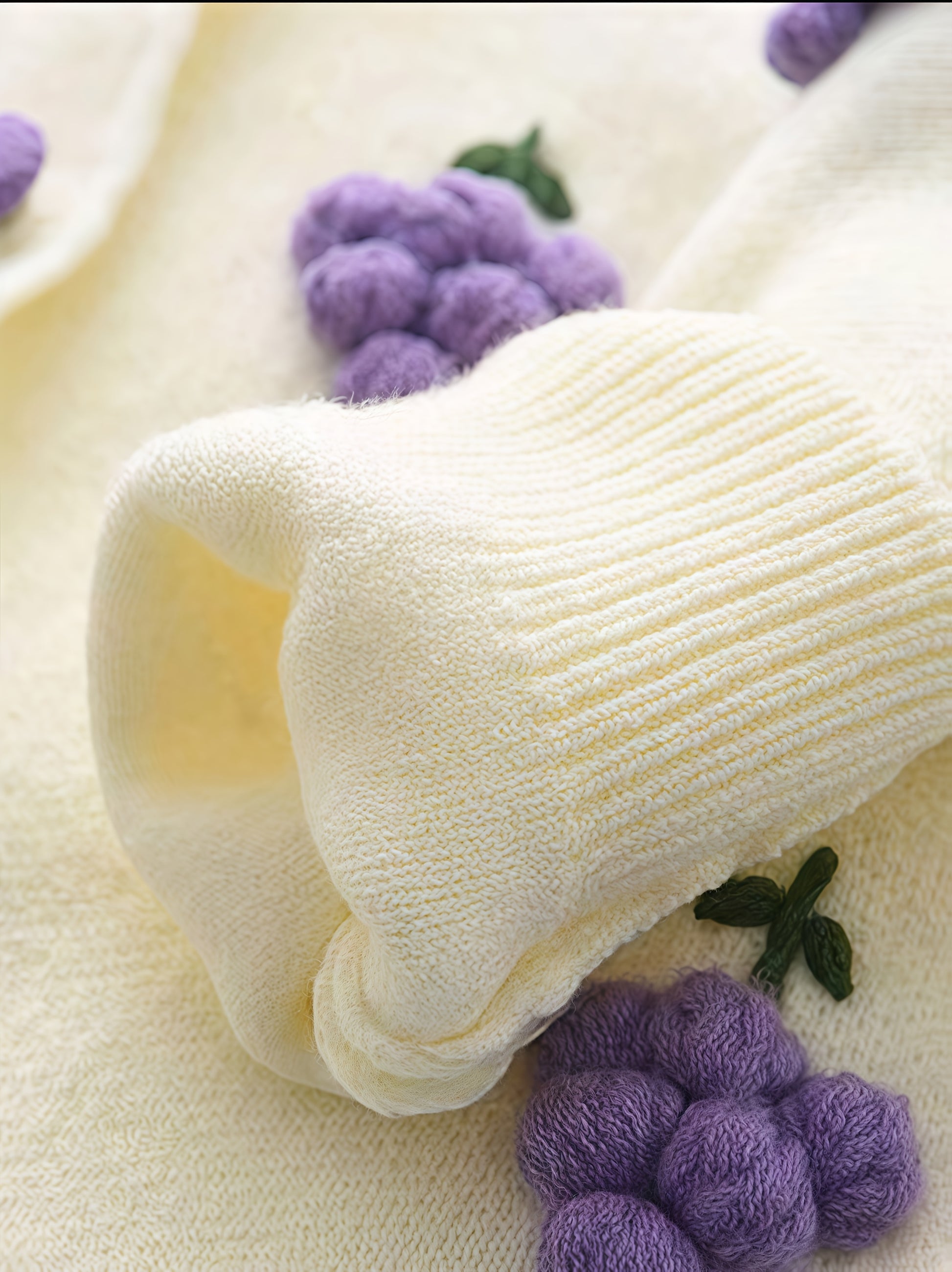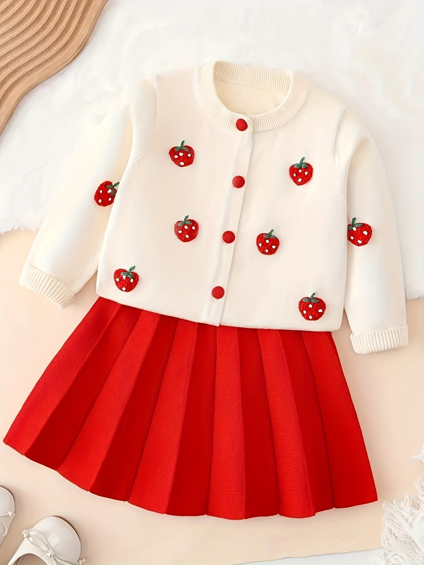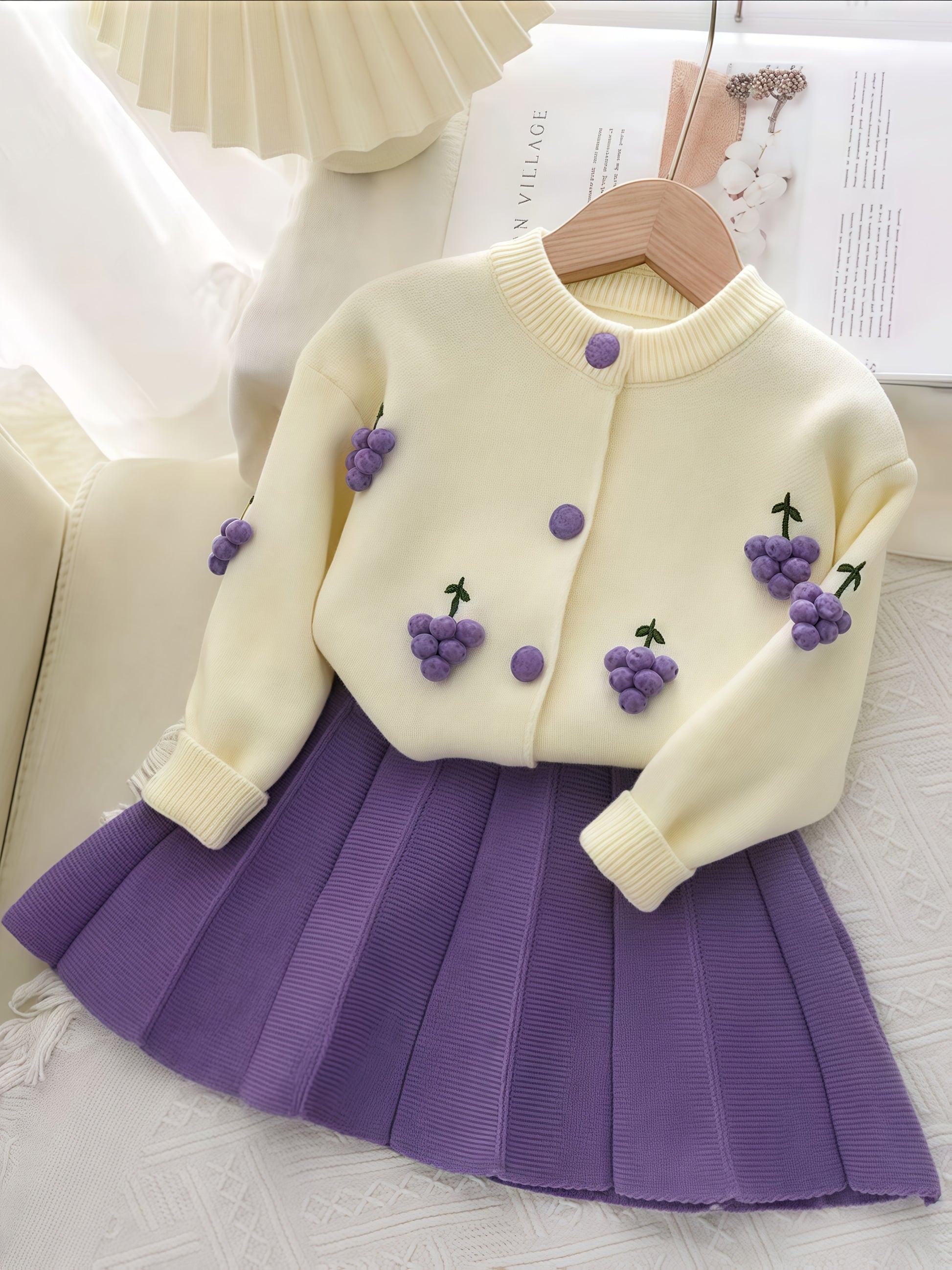 Girls’ 2-Piece Furry Fruit Sweater & Pleated Skirt Set – Cozy Purple Knitwear Outfit for Daily Wear or Parties in Autumn/Winter