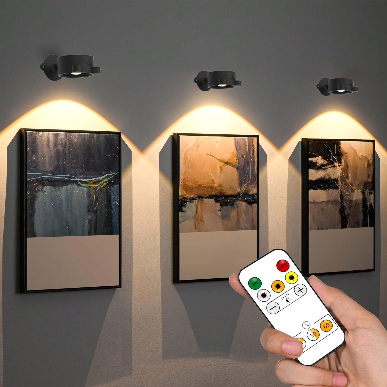 Three wall sconces with adjustable color temperature and dimming options. Both button and remote controls allow you to change the color temperature (3000K-4500K-6000K). There are two methods for dimming these magnetic wall lights: using the button for stepless adjustment (long press) or the remote control with dimming buttons ('+' and '-'). You can select the color temperature and brightness according to various usage situations.