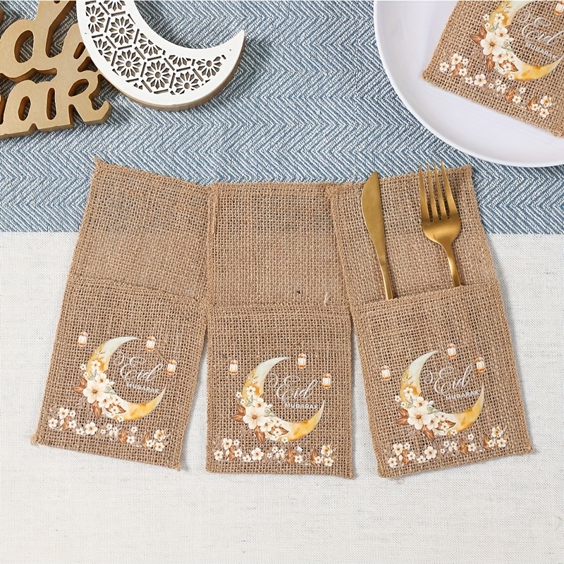 Set of 5 Eid-Themed Linen Bags Featuring Moon Lanterns And Flowers, Perfect for Ramadan Celebrations. These Burlap Bags Are Ideal for Eid Mubarak Decorations at Home And for Islamic Muslim Party Supplies, Including Tableware