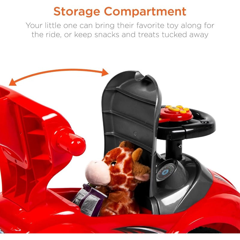 The steering wheel features buttons that let your child honk the horn or enjoy a selection of fun songs during their ride.