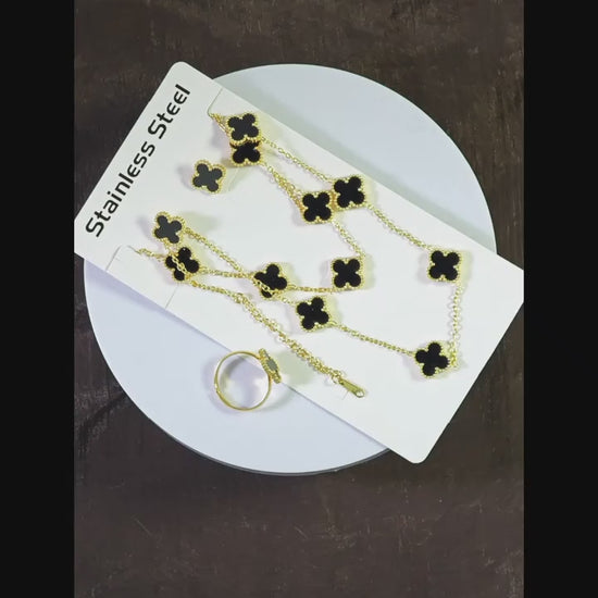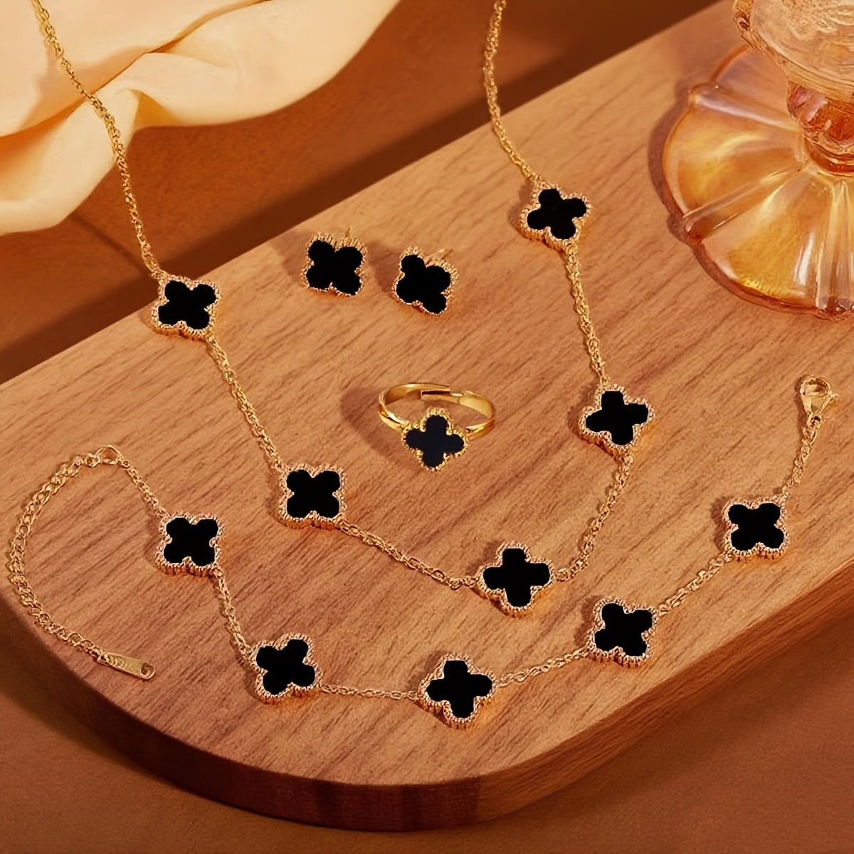 Women’s 5-Piece Stainless Steel Jewelry Set – Minimalist Four-Leaf Clover Necklace, Bracelet, Earrings & Ring, Elegant Daily & Party Gift Set (No Plating)