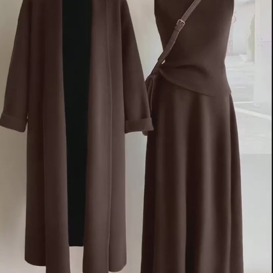 Women’s Elegant 3-Piece Outfit Set – Long Cardigan Jacket, High-Neck Vest & Skirt, Solid Color Chic Ensemble for Casual or Formal Events