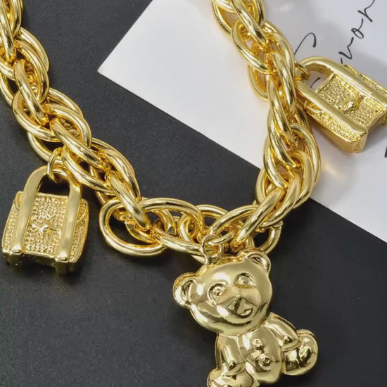 ZEADEAR Golden-Tone Bear & Handbag Charm Bracelet – Cute Copper Jewelry with Teddy Bear and Lock Pendants for Daily Wear or Special Gifts